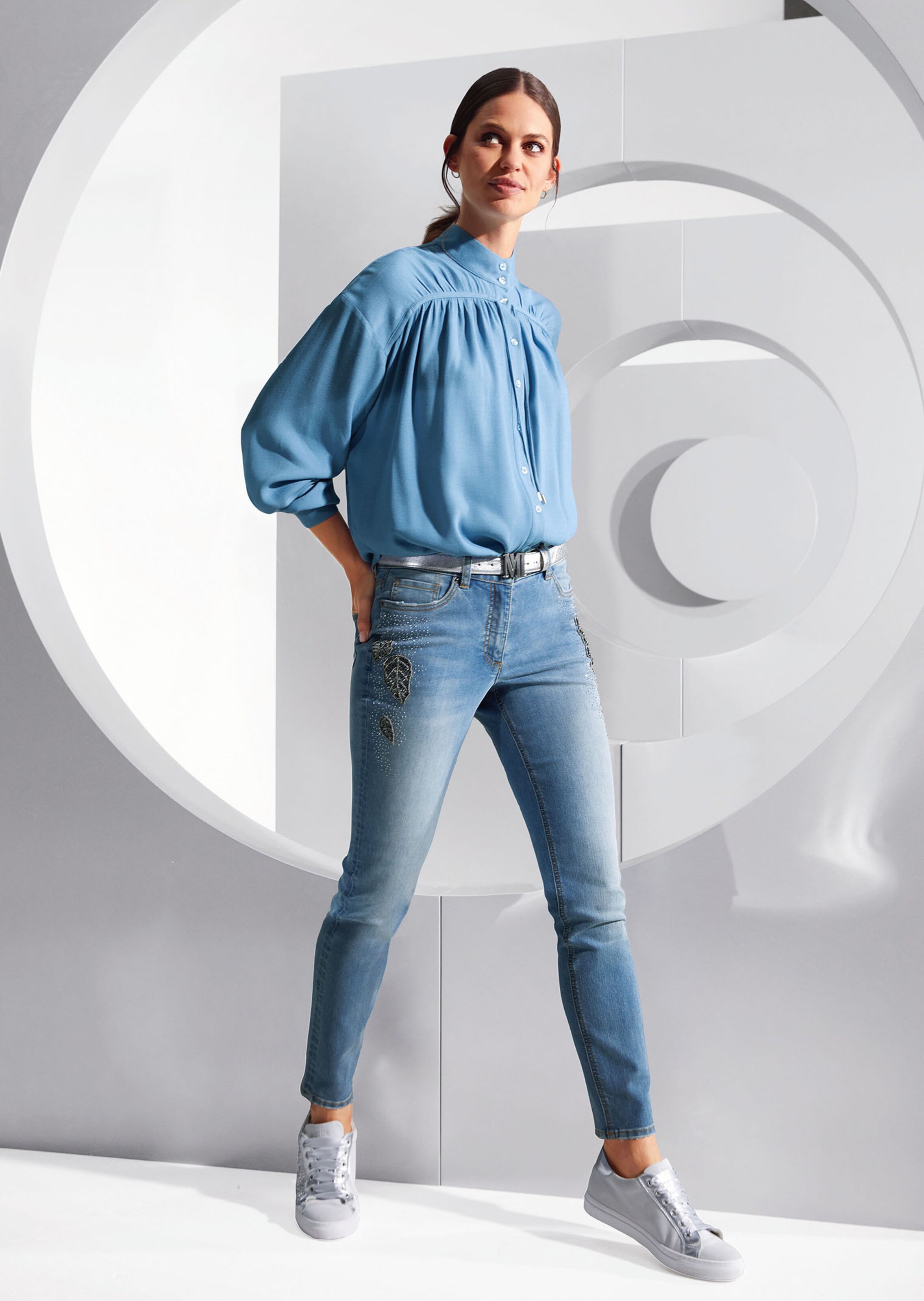 Smal gesneden 5-pocket-model met licht waseffect en sierlijke decoratie van blaadjes en siersteentjes. Rechte lijn met tailleband en riemlusjes.