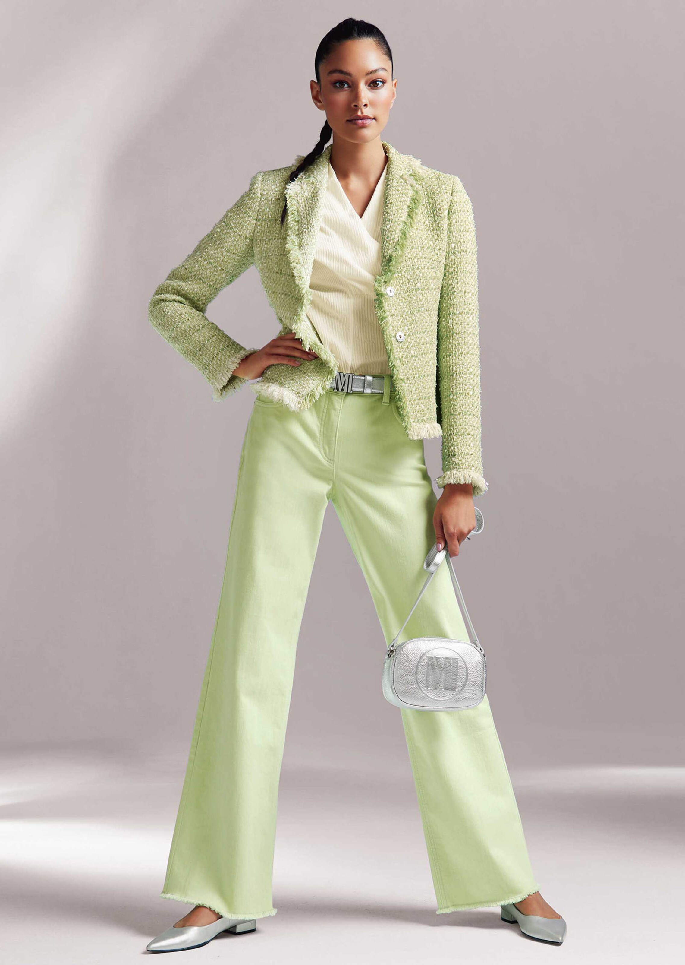 In 5-pocket-style met wijde pijpen, vormgevende tailleband met riemlusjes en franjezoom.