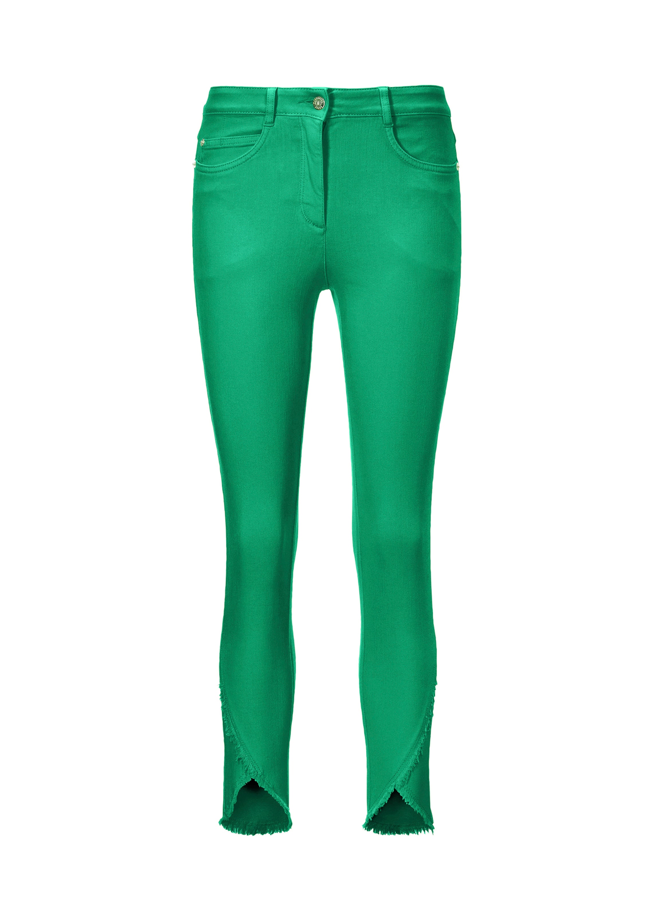 Smal gesneden 5-pocket-style met vormgevende tailleband, riemlusjes, vormgevende pas aan de achterkant en trendy franjezoom.
