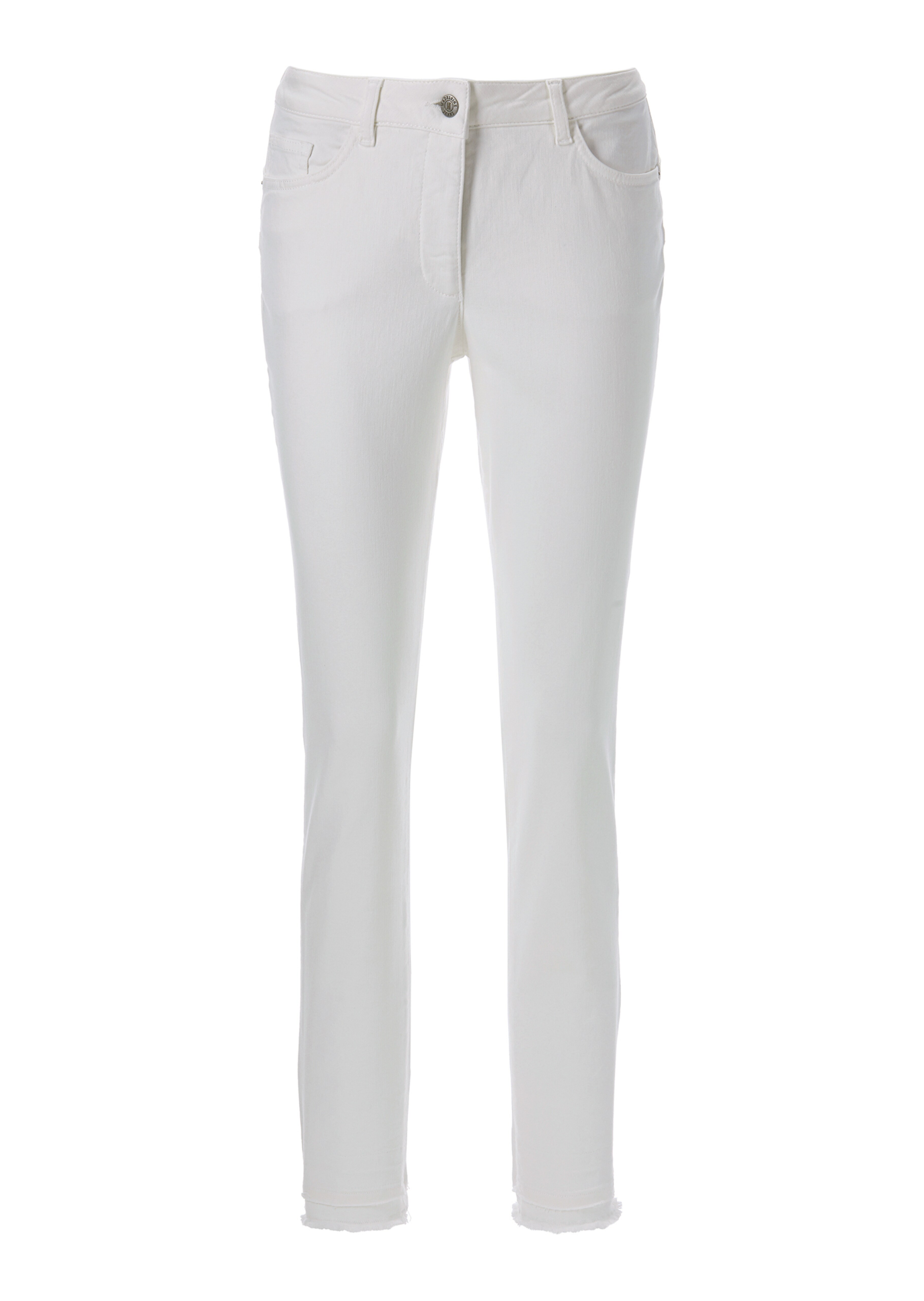 Smal gesneden model met dubbele franjezoom. Heerlijk zittende 5-pocket-style in een lengte tot op de enkel,met tailleband; cool geaccentueerd door lichte waseffecten.