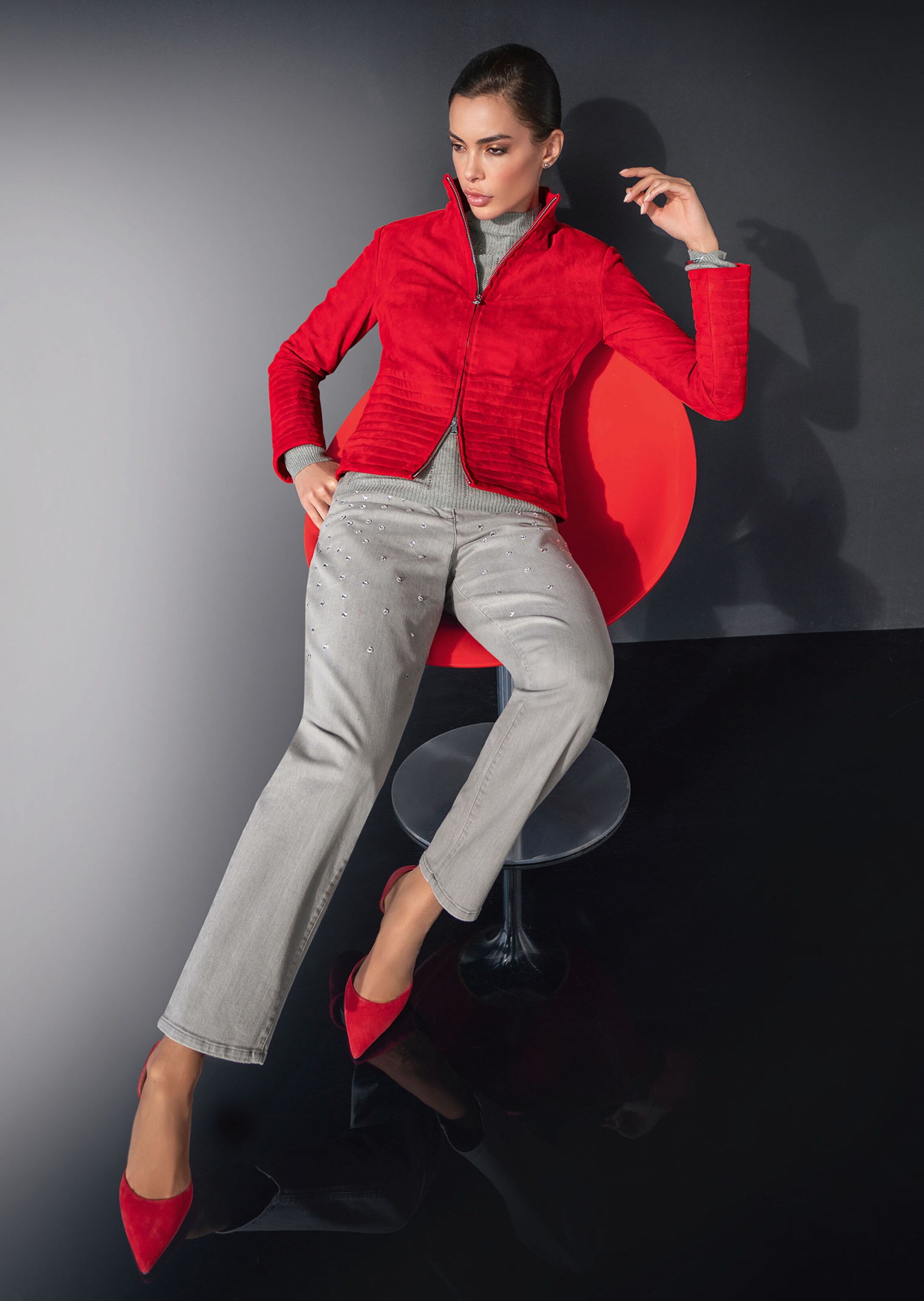 Met grote, fonkelende strasstenen op het bovenbeen. Casual 5-pocket-model, valt op de enkels en met rechte pijpen. Vormgevende tailleband met riemlusjes.