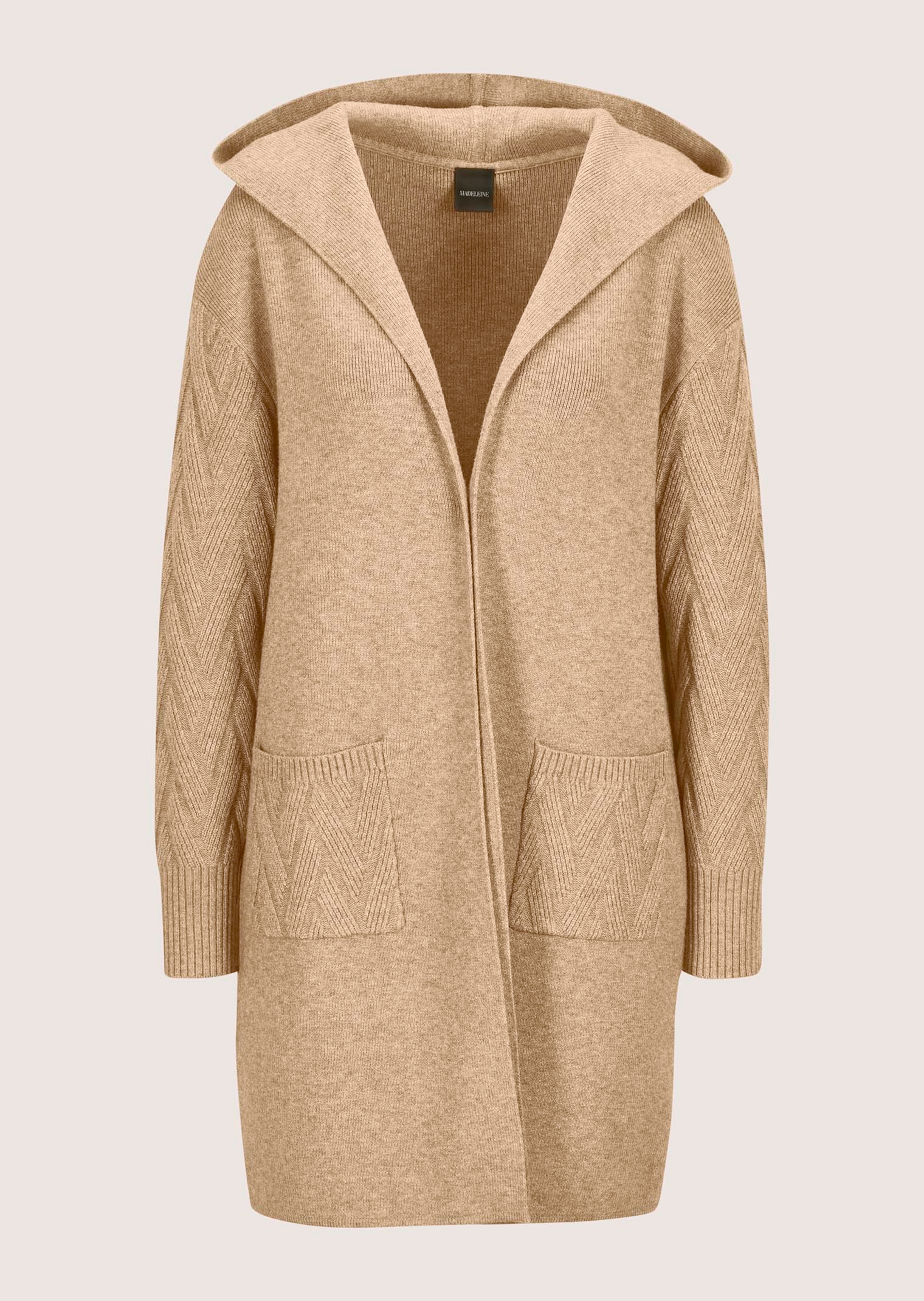 Elegant glad breisel in een modieus, casual lang model, zonder sluiting, met capuchon, lange mouwen en opgestikte zakken. Mouwen en zakken in een hoogwaardig jacquardpatroon. Mouwen met brede, vormvaste ribboorden.