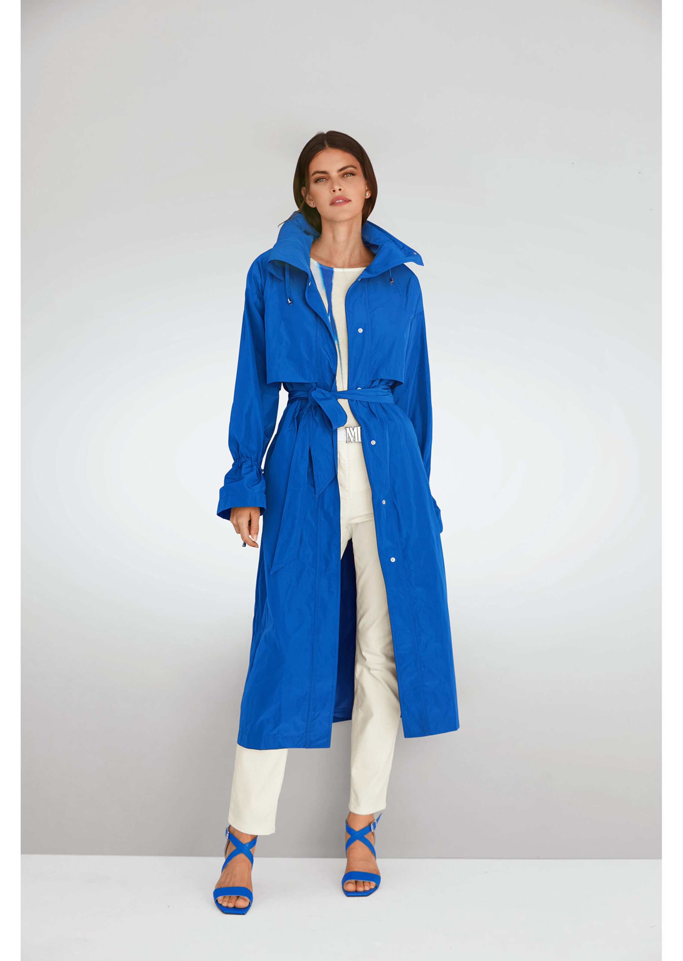 In shape-memory-kwaliteit. Met strikceintuur, karakteristieke trenchcoat-details, een blinde drukknopenlijst en sierzakken met drukknoop. De uiteinden van de mouwen en de opstaande kraag zijn met een tunneltje te reguleren.