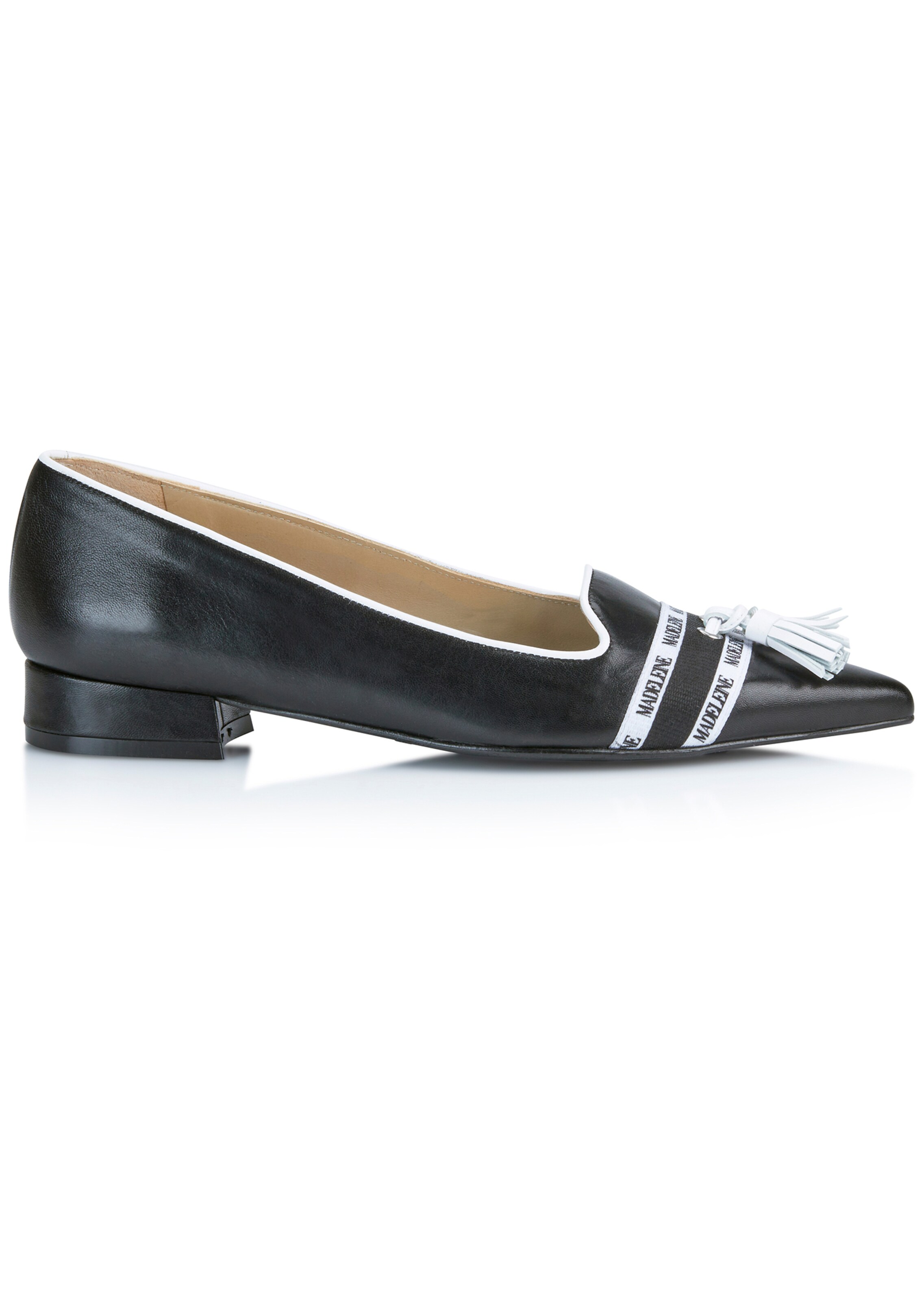Met de hand gemaakt in Spanje van zacht leer. In een modieus spits toelopend model met een mooi contrasterende bies, een leren kwast en smalle biesjes met MADELEINE-logo.
