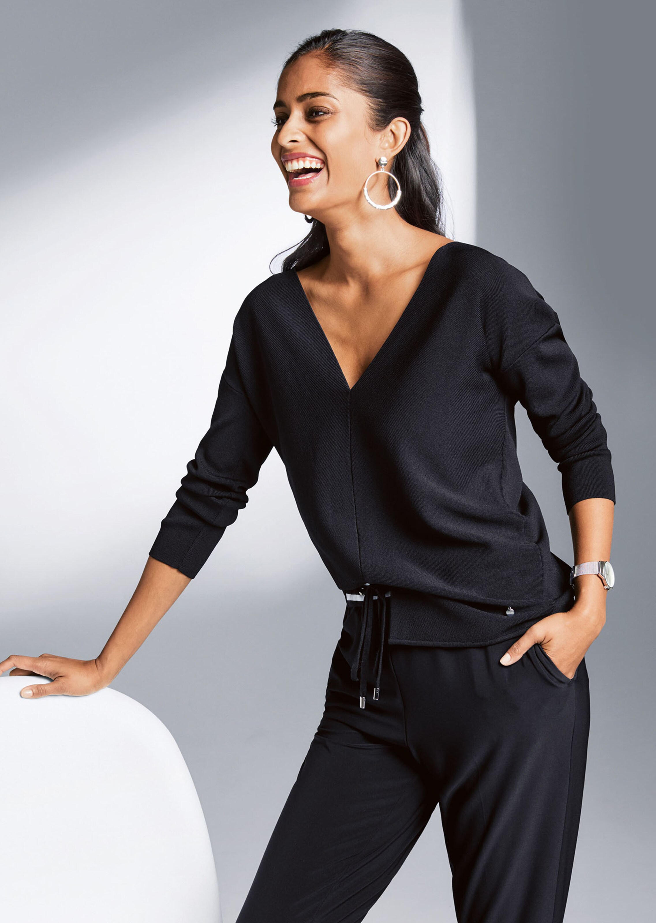 Puristisch elegante, eenvoudige stijl met V-hals, aangebreide schouders, lange mouwen en zoomsplitje. Chique mix met viscose.