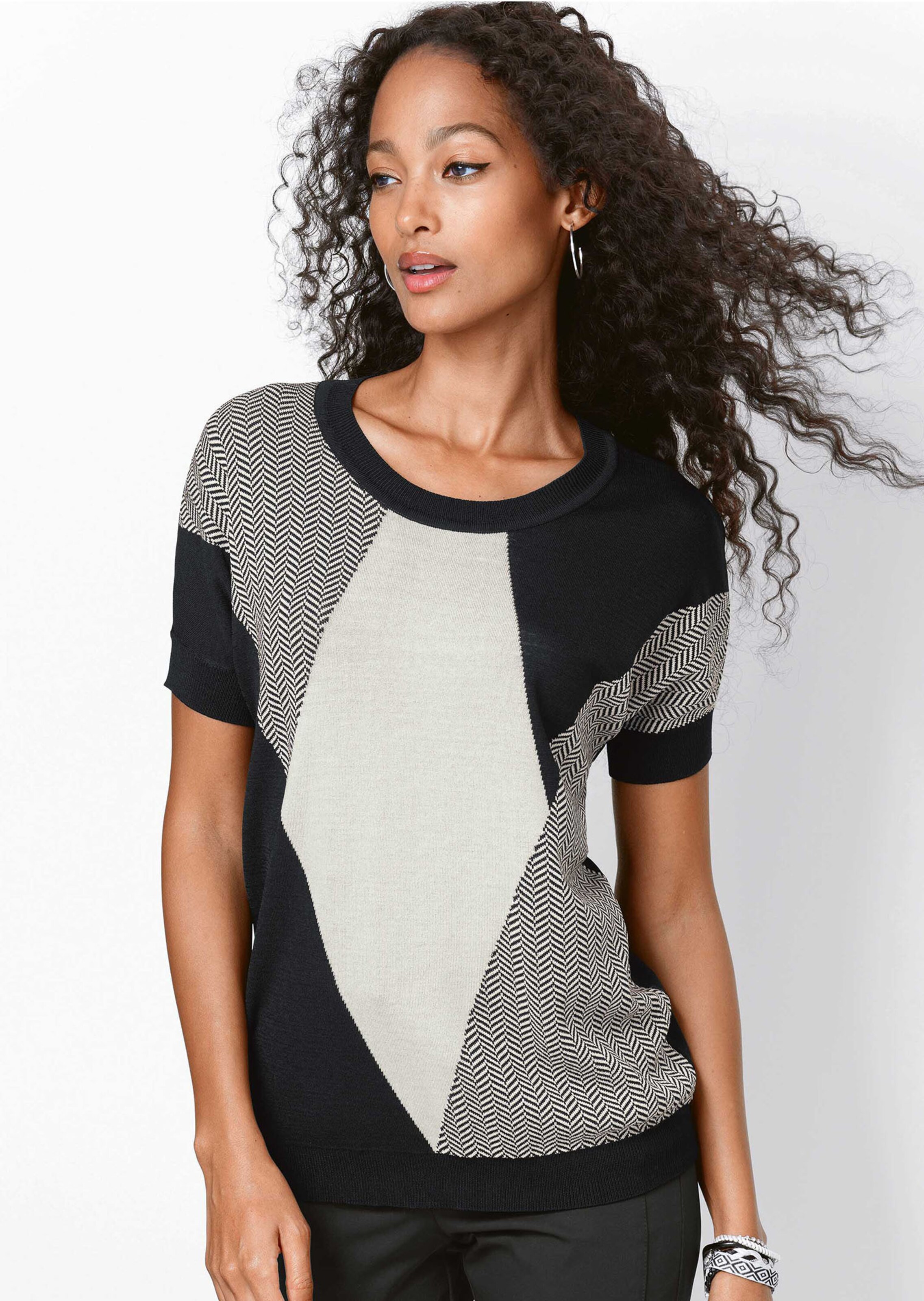 Met stijlvolle, two-tone jacquardtricot aan de voorkant. Lichtjes casual model met blousonwijdte, ronde halslijn, ribboordjes en korte mouwen.