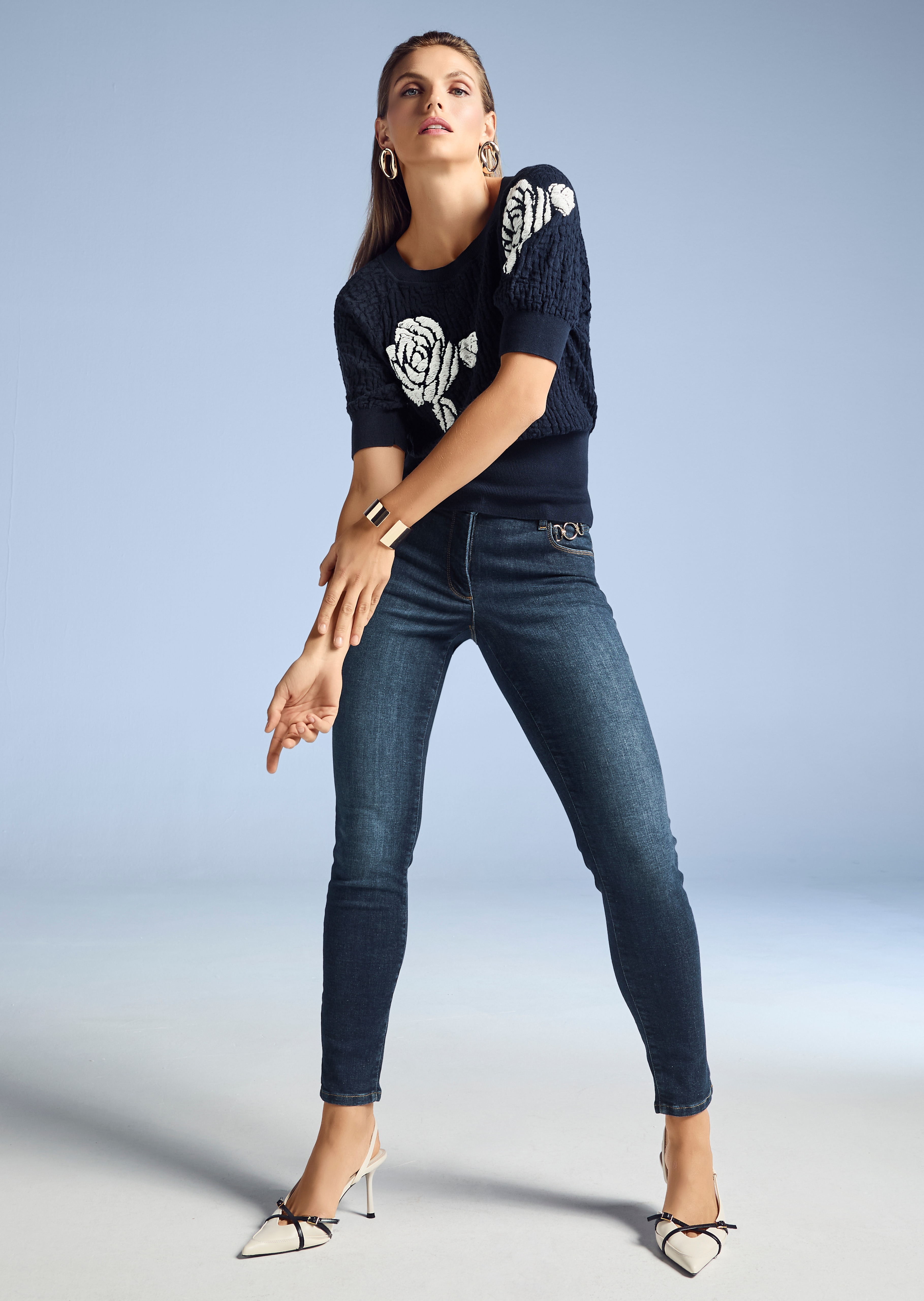Een zeer hoogwaardige trui met een bijzondere look qua design. Gestructureerde cloque-look met ingeweven jacquardbloemen. Ronde halslijn met een smalle ribboord, halflange mouwen en zoom met vormvaste ribboordjes. Gemaakt van zacht Italiaans garen.