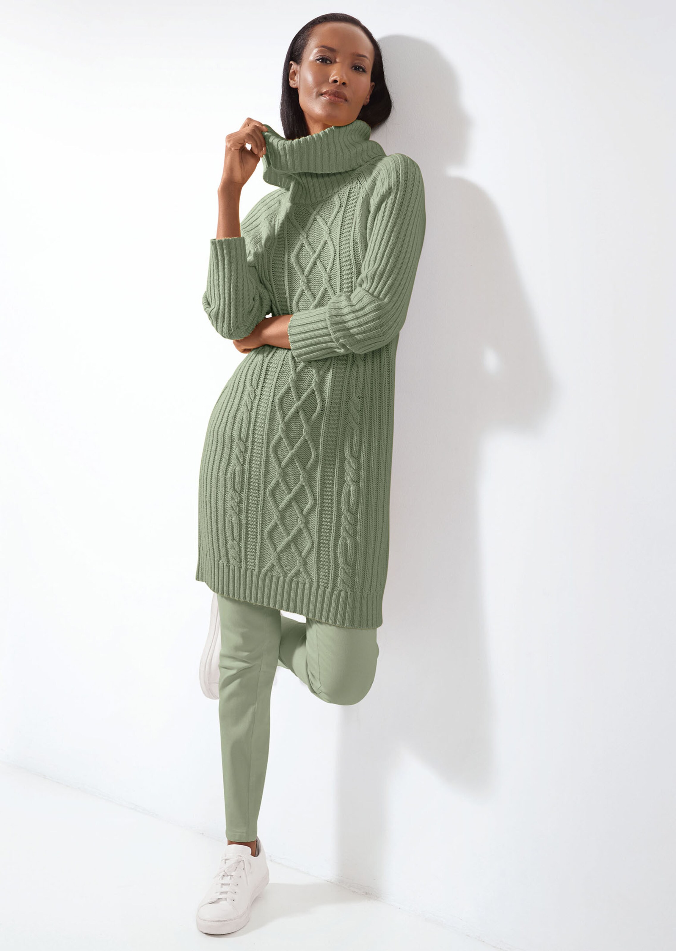 In modieus casual, boxy model, waardevol fully fashioned met een kabelpatroon middenvoor en middenachter en met lange raglanmouwen. Markante col in grove ribtricot.