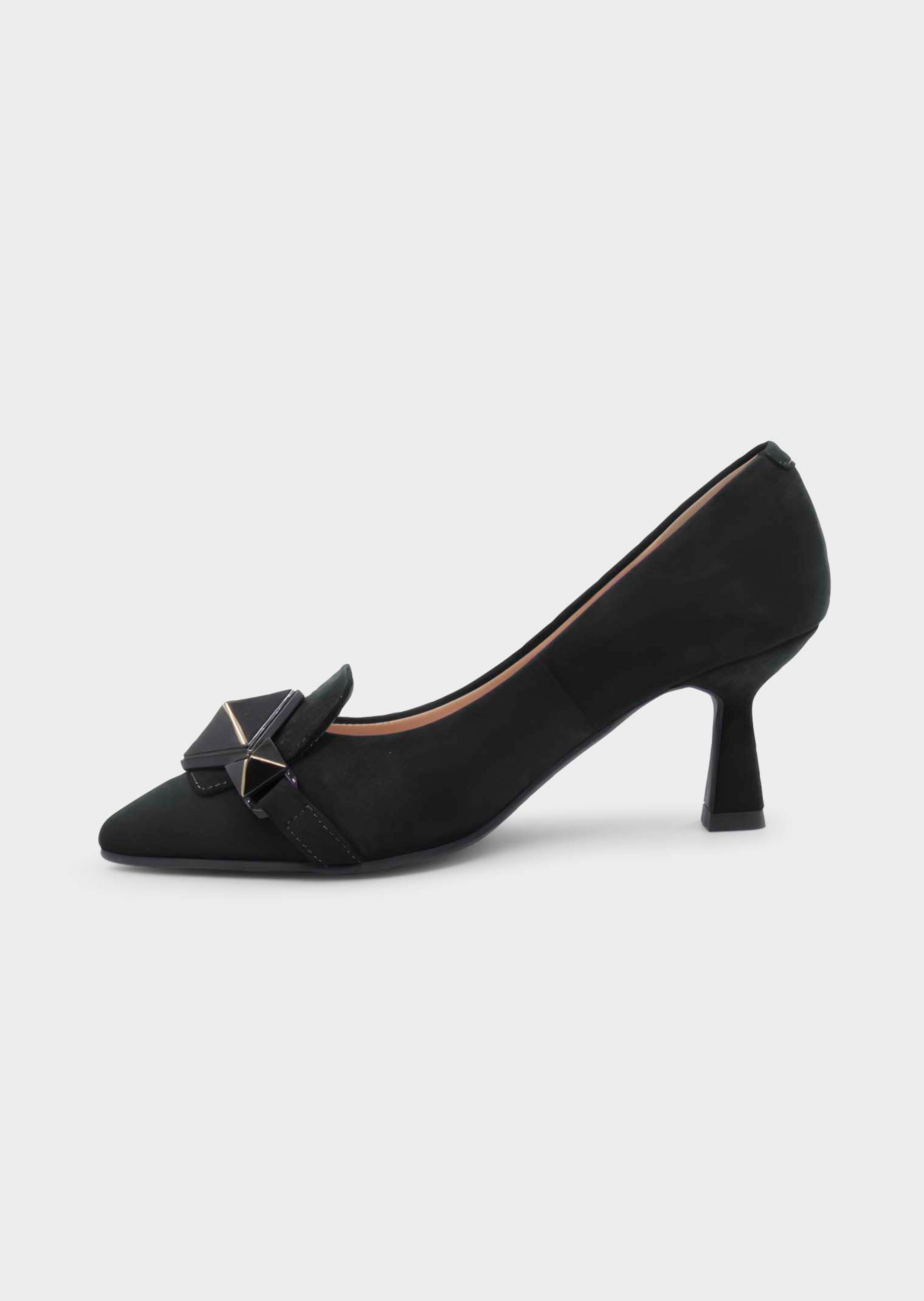 Zacht suède in een spitse vorm. Met decoratief metalen sierelement.