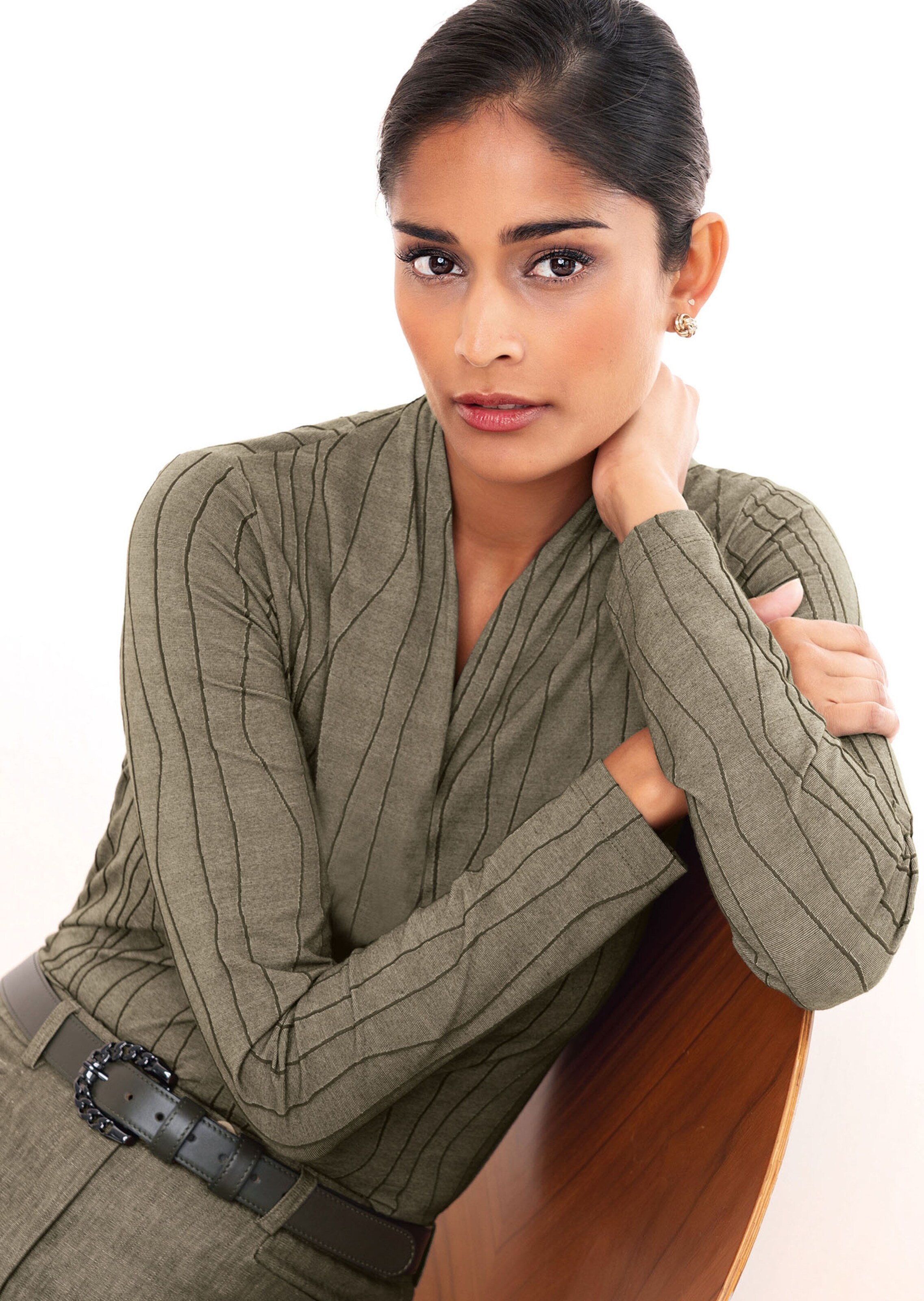 Figuuraccentuerend model met lange mouwen, V-hals en biezenstructuur. Elastische, onderhoudsvriendelijke kwaliteit.