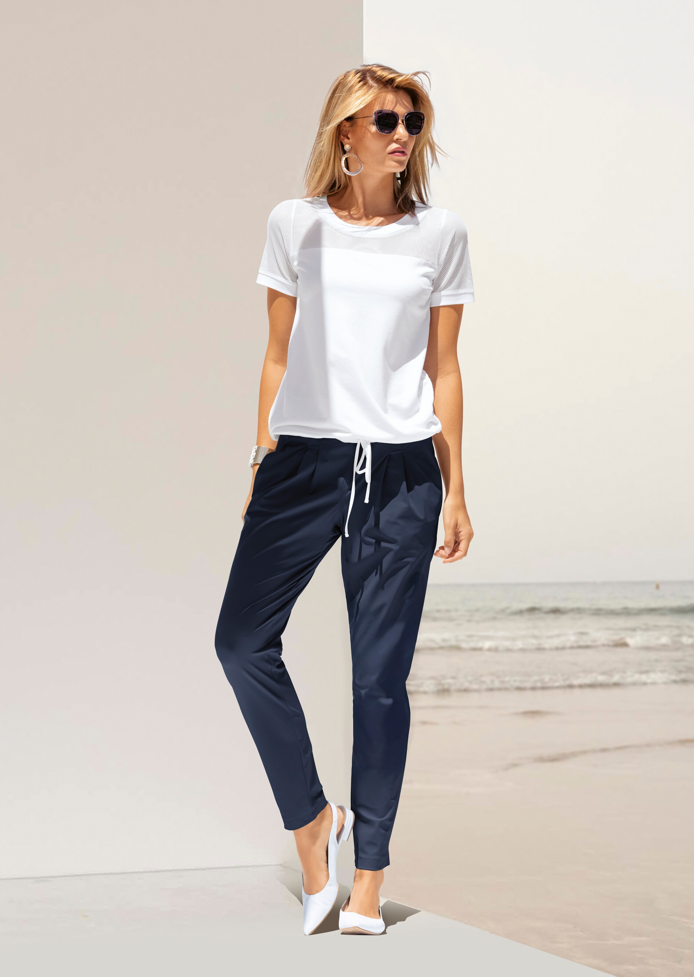 Met netinzetten aan de schouders en korte mouwen. Casual model met tricot boordjes langs de ronde hals en de korte mouwen. Variabel tunnelkoordje in de zoom.