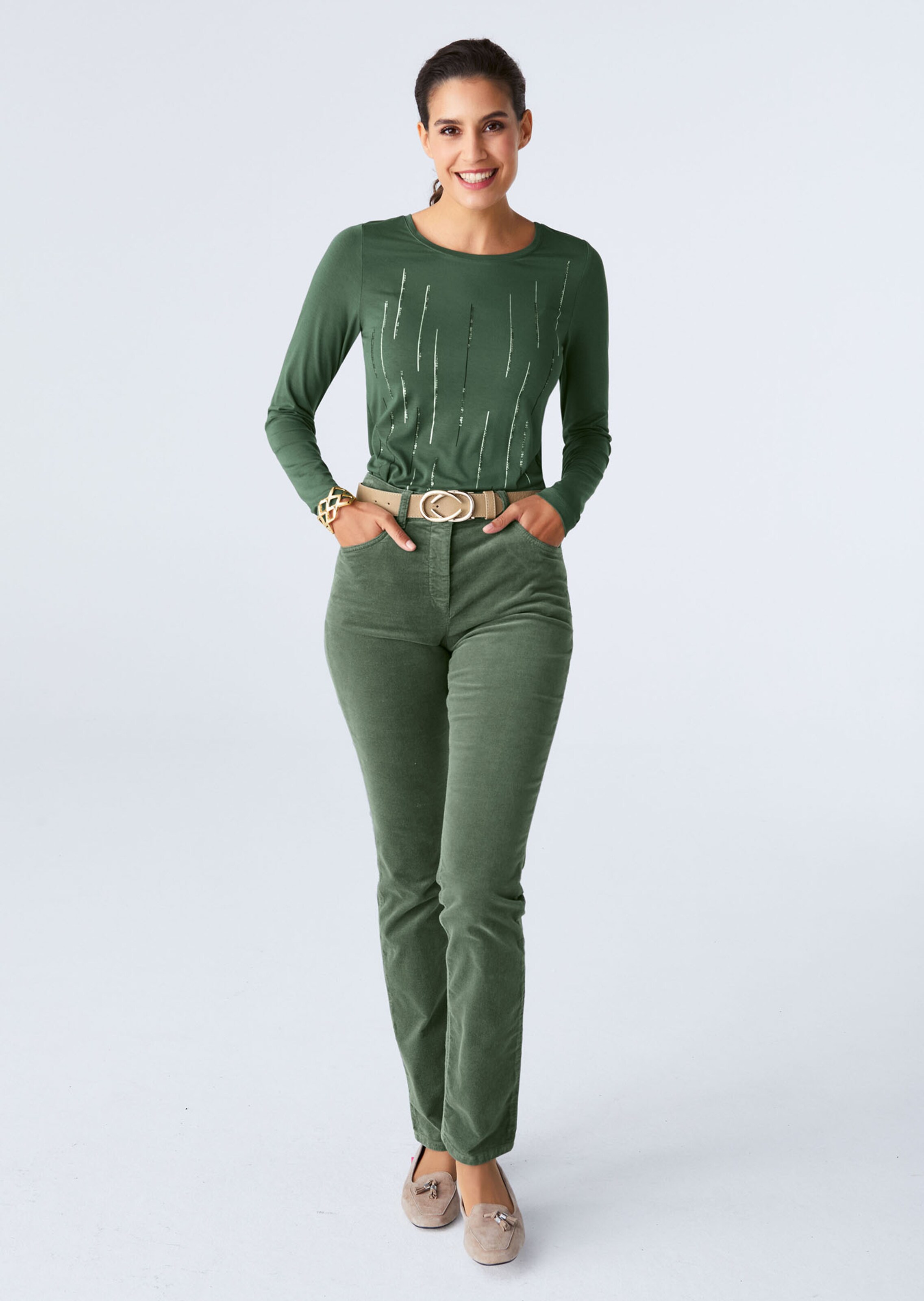 In nieuwe, verfijnde variant met glanzende print en waardevol glimmende, mooi gepositioneerde pailletten. Met ronde halslijn en lange mouwen.