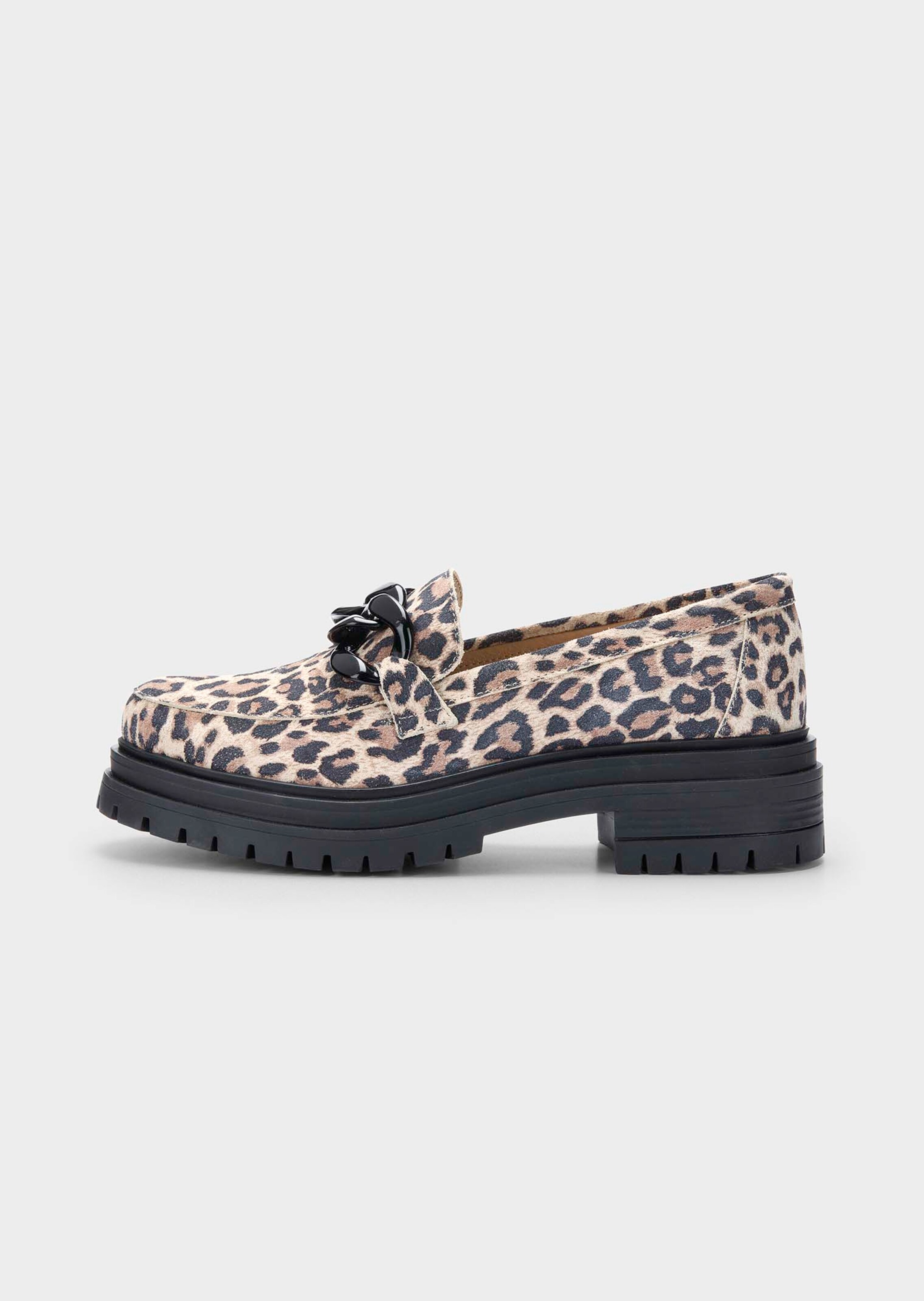 Fluweelachtig suèdeleer met luipaardprint, sierketting en bijpassend gekleurde zool.