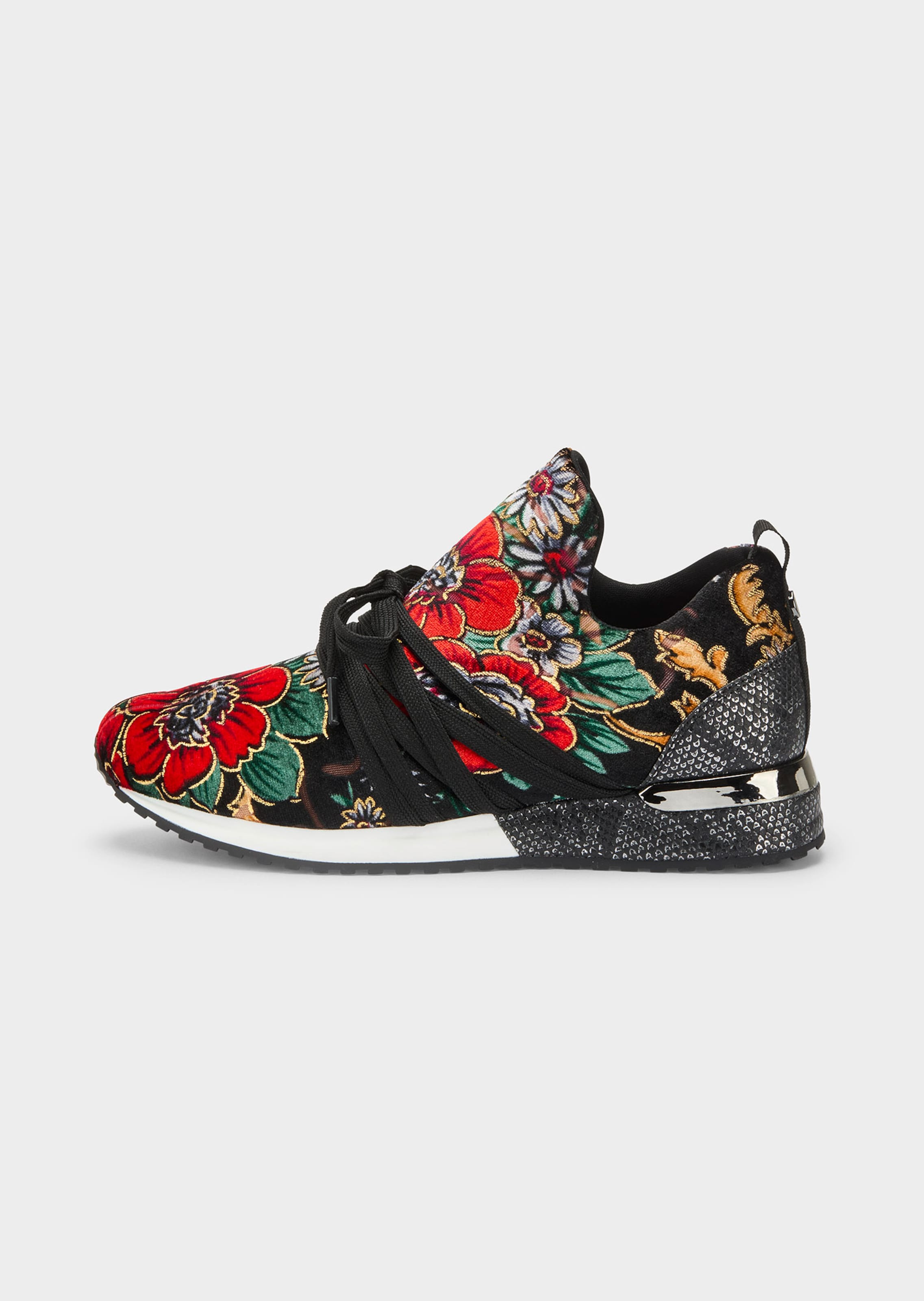 Fluweelachtig textiel met een bloemenpatroon en decoratieve vetersluiting van LA STRADA. Comfortabel slip-in model. In E-breedte met uitneembaar voetbed en binnenwerk van textiel.