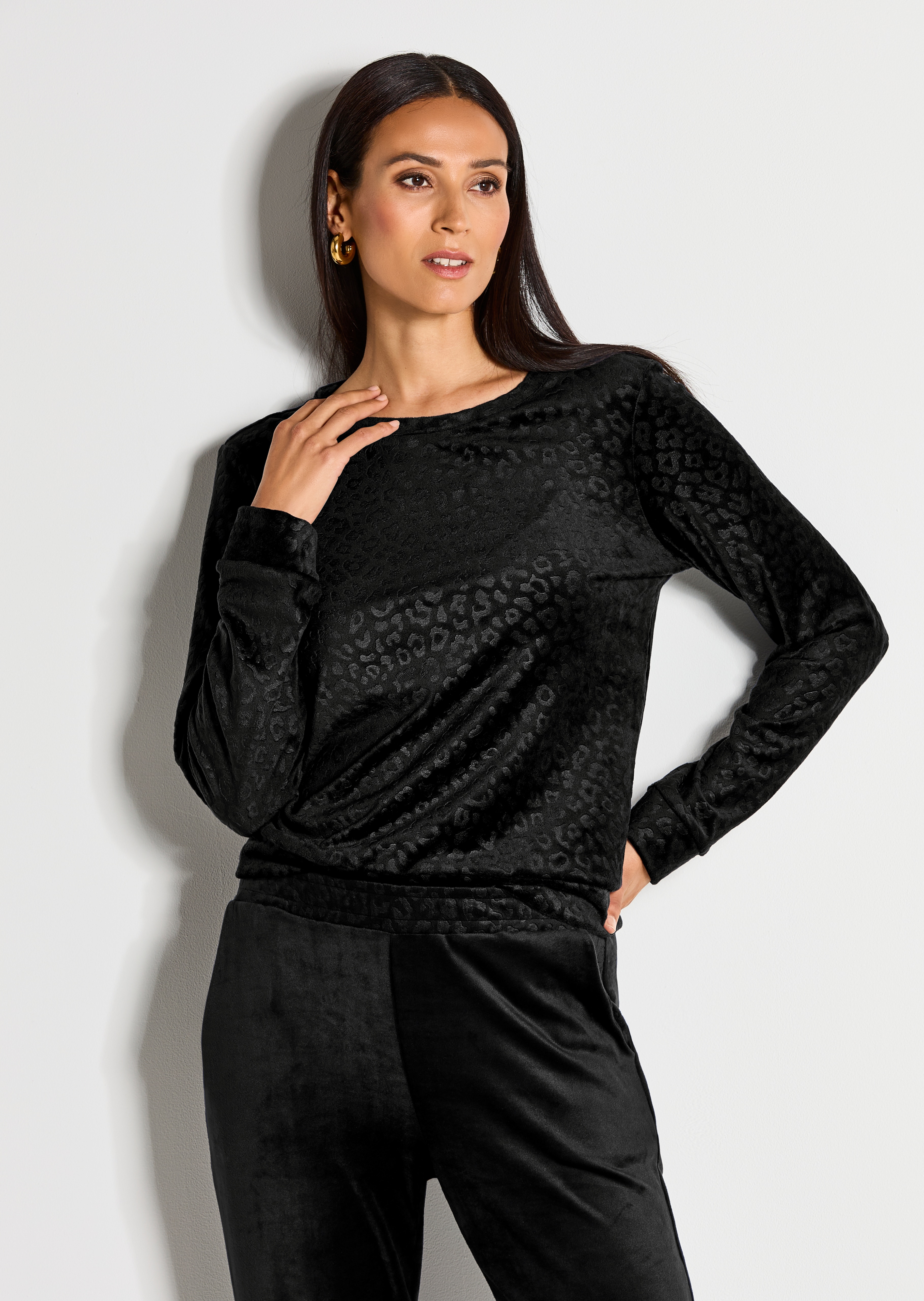 Heerlijk comfortabele stretchstof met dierenmotief in reliëf. Modieus, casual model met een ronde hals en lange mouwen. Brede elastische manchetten en zoom.