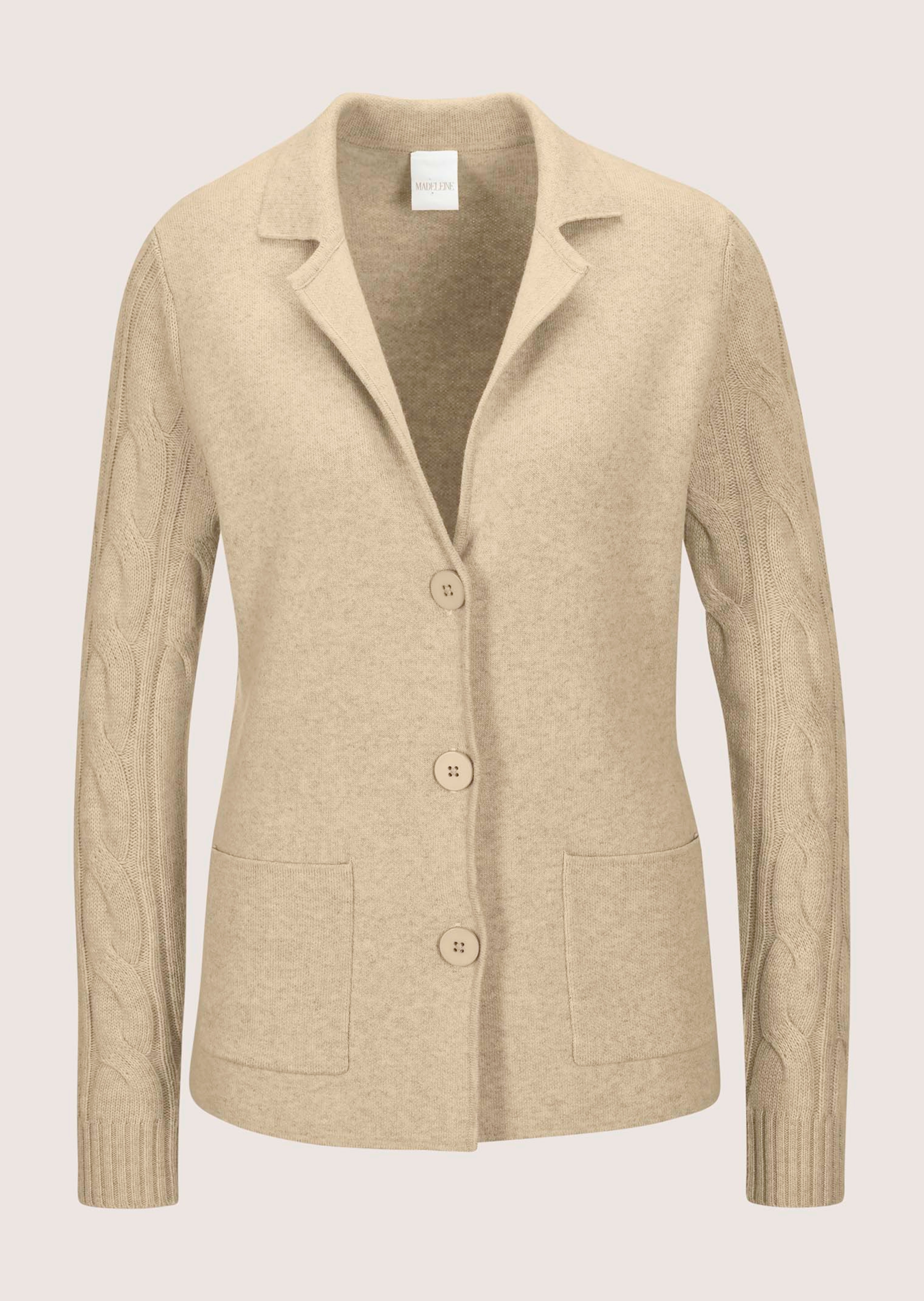 Aangenaam zachte wolmix van hoge kwaliteit, voelt verfijnd aan en is supercomfortabel. Glad gebreid lijfje met een reverskraag, doorlopende knopenlijst en opgestikte zakken. Lange mouwen in een opvallend kabelpatroon met manchetten met vormvaste ribboorden.