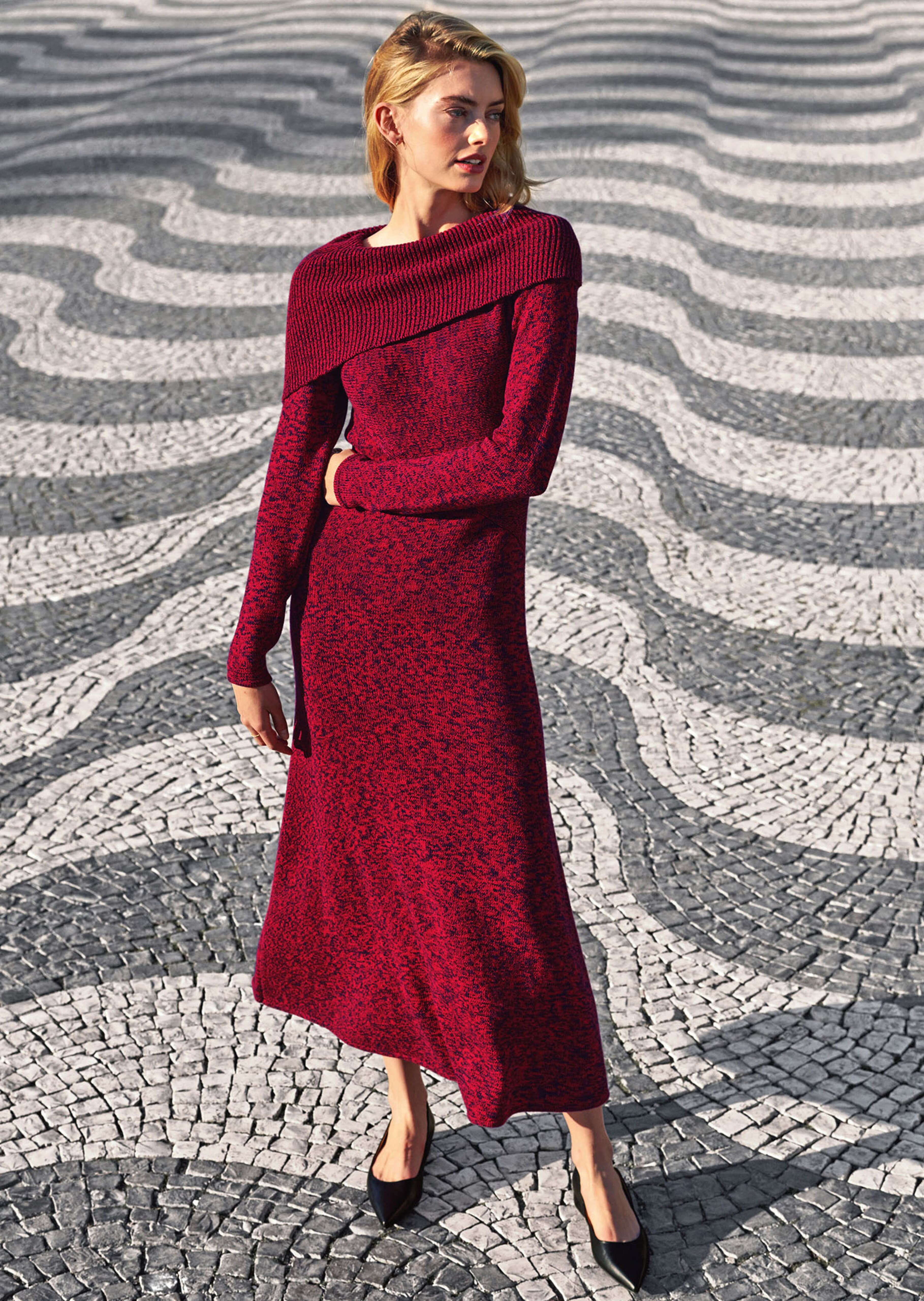 In modieus gemêleerde look met asymmetrische Carmen-kraag. Figuuraccentuerend, onderaan licht uitlopende snit met lange mouwen en mooi omgeslagen tunnelzomen. Kan ook off-the-shoulder gedragen worden.