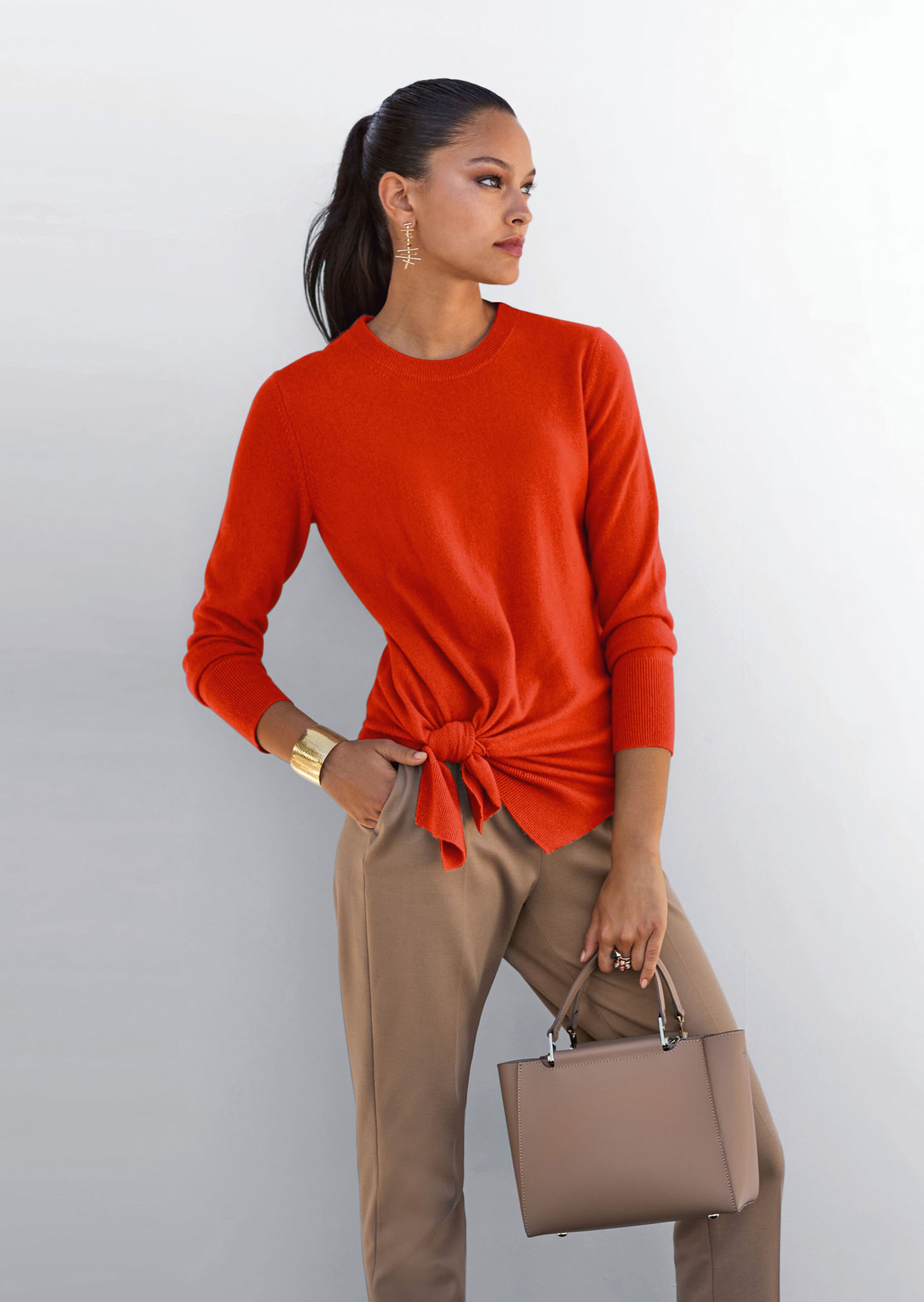 Luxe item in getailleerd model, met sierknoop opzij, een ronde halslijn en lange mouwen.