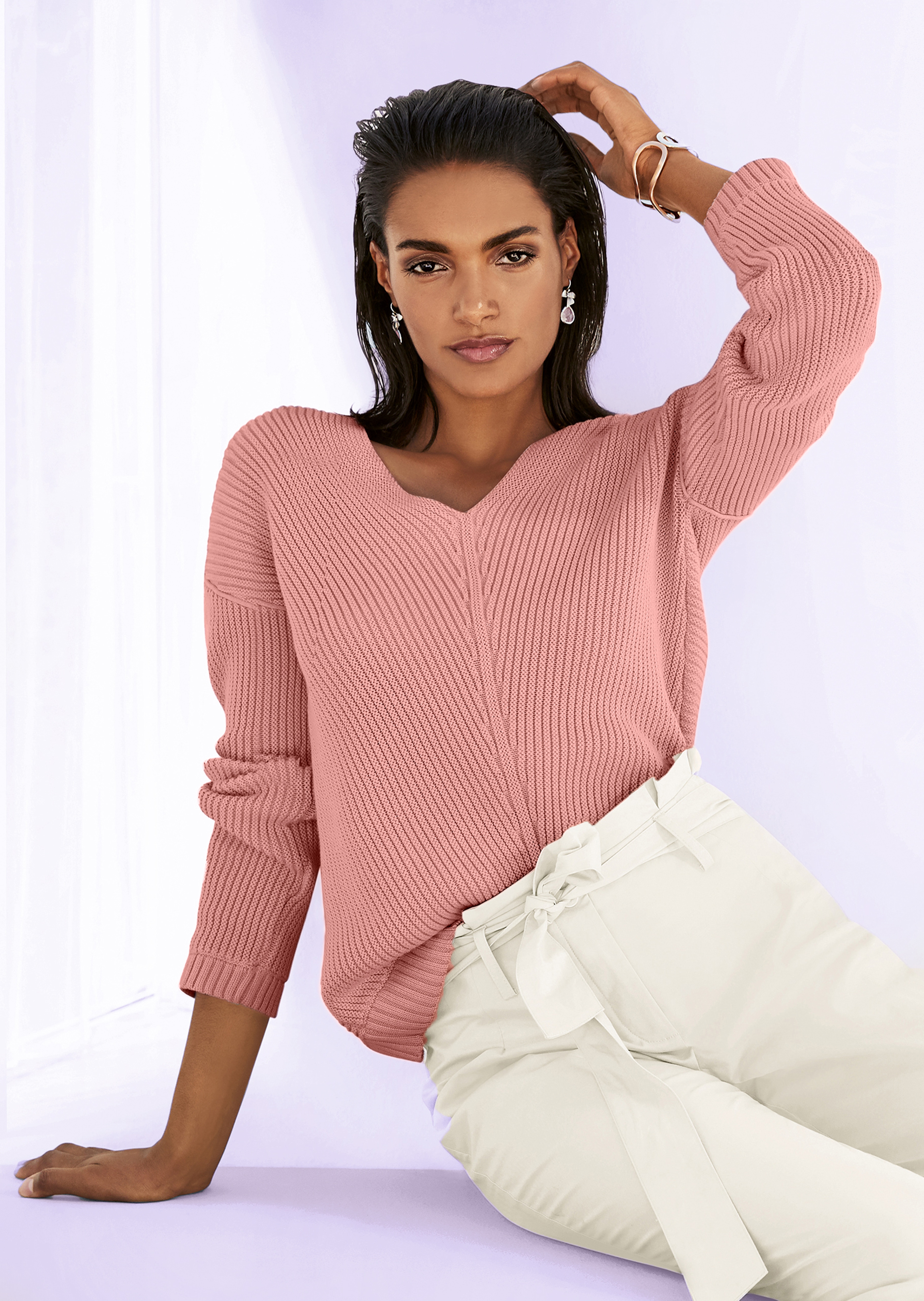 Van huidvriendelijk natuurgaren in modieus casual lijn met V-hals en lange mouwen. Tegengesteld verlopende ribstructuren zorgen voor een zeer moderne look.