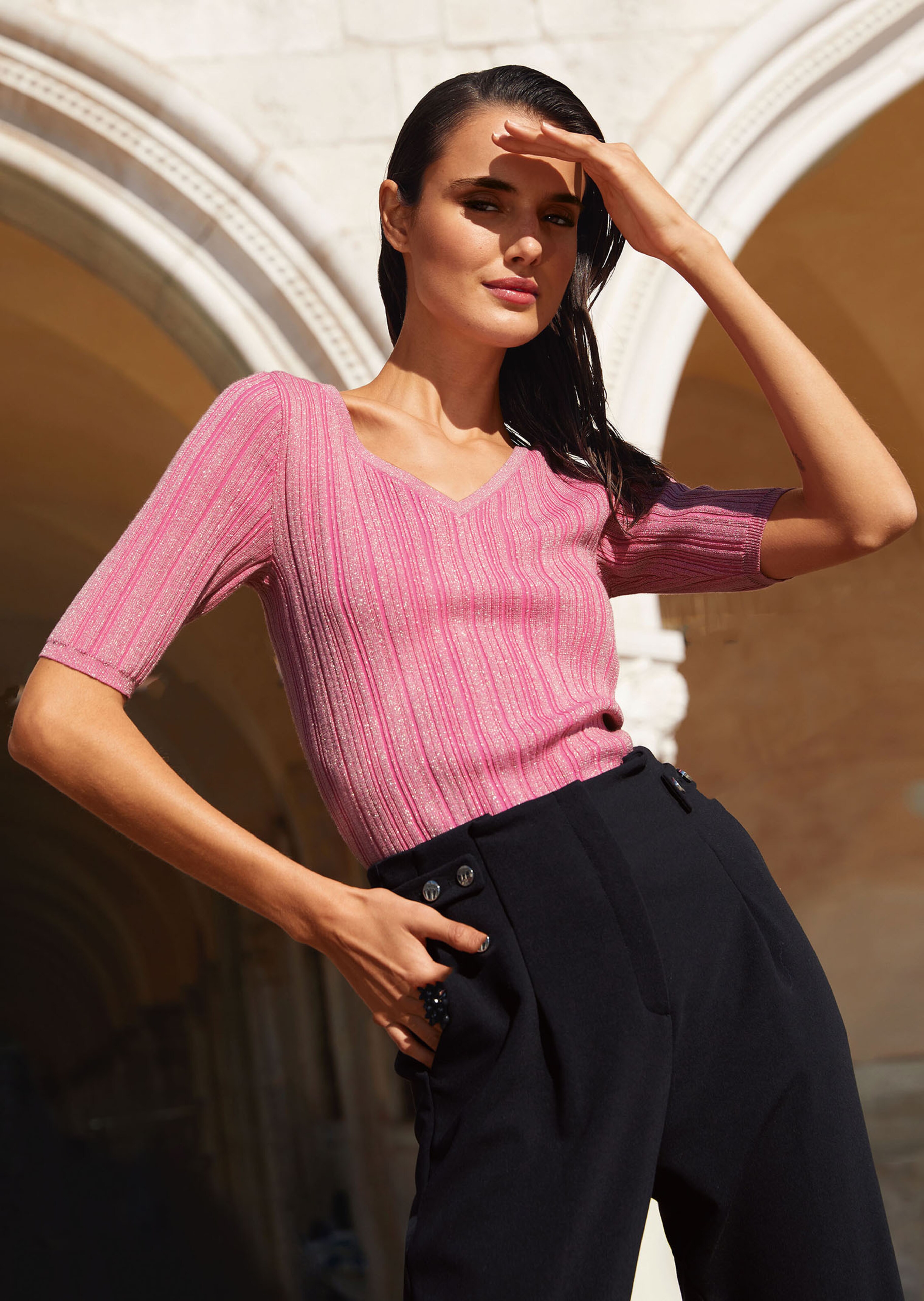 In een modieuze mix met ribben en een chic accent met glansgaren. Vrouwelijk smalle trendstyle met V-hals aan de voor- en achterkant. Halflange mouwen.