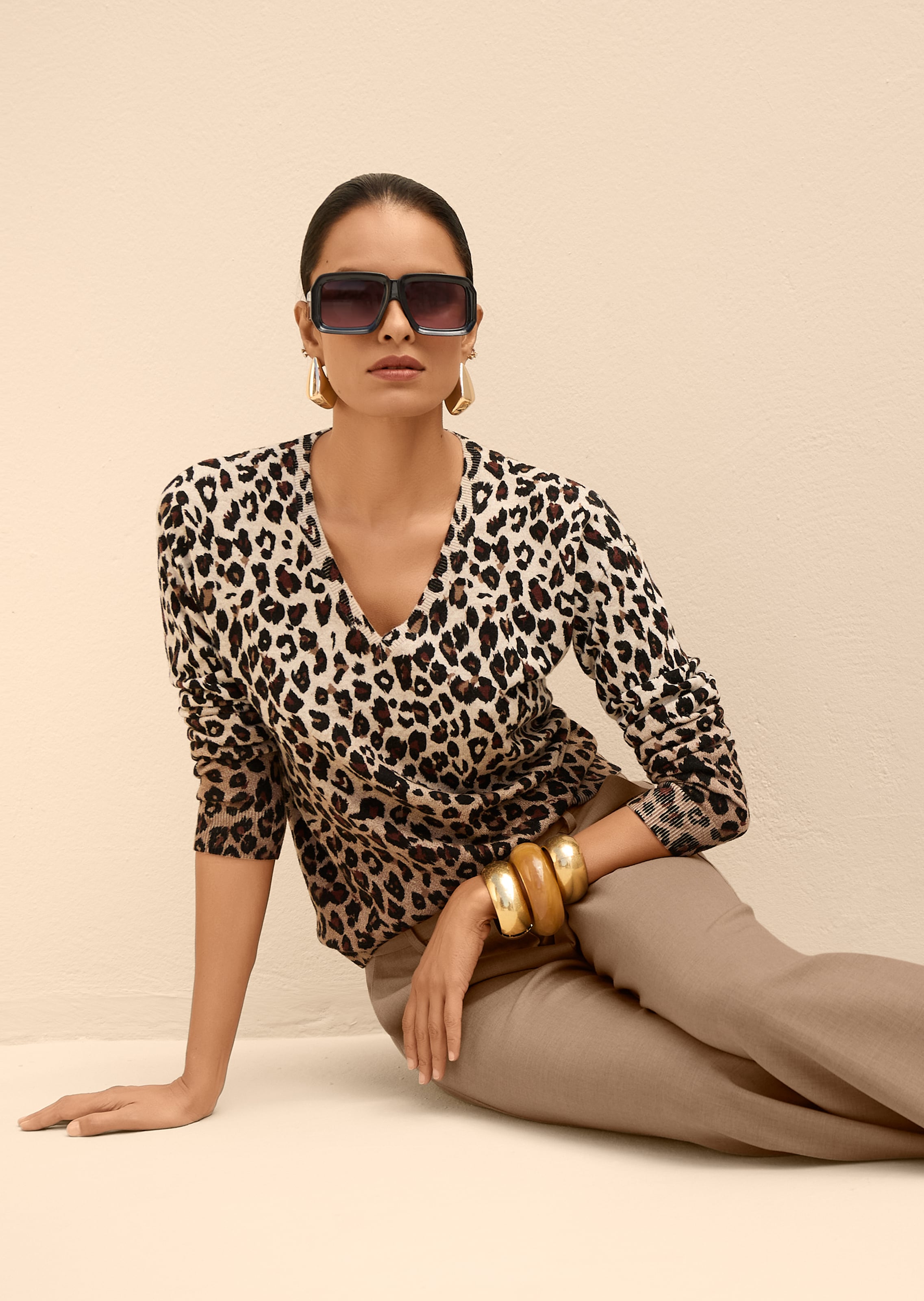 Heerlijk zacht en aangenaam licht, gemaakt van fijn natuurlijk garen in een trendy animal-design rondom en met een zacht kleurverloop. Met V-hals, aangebreide schouders en lange mouwen.