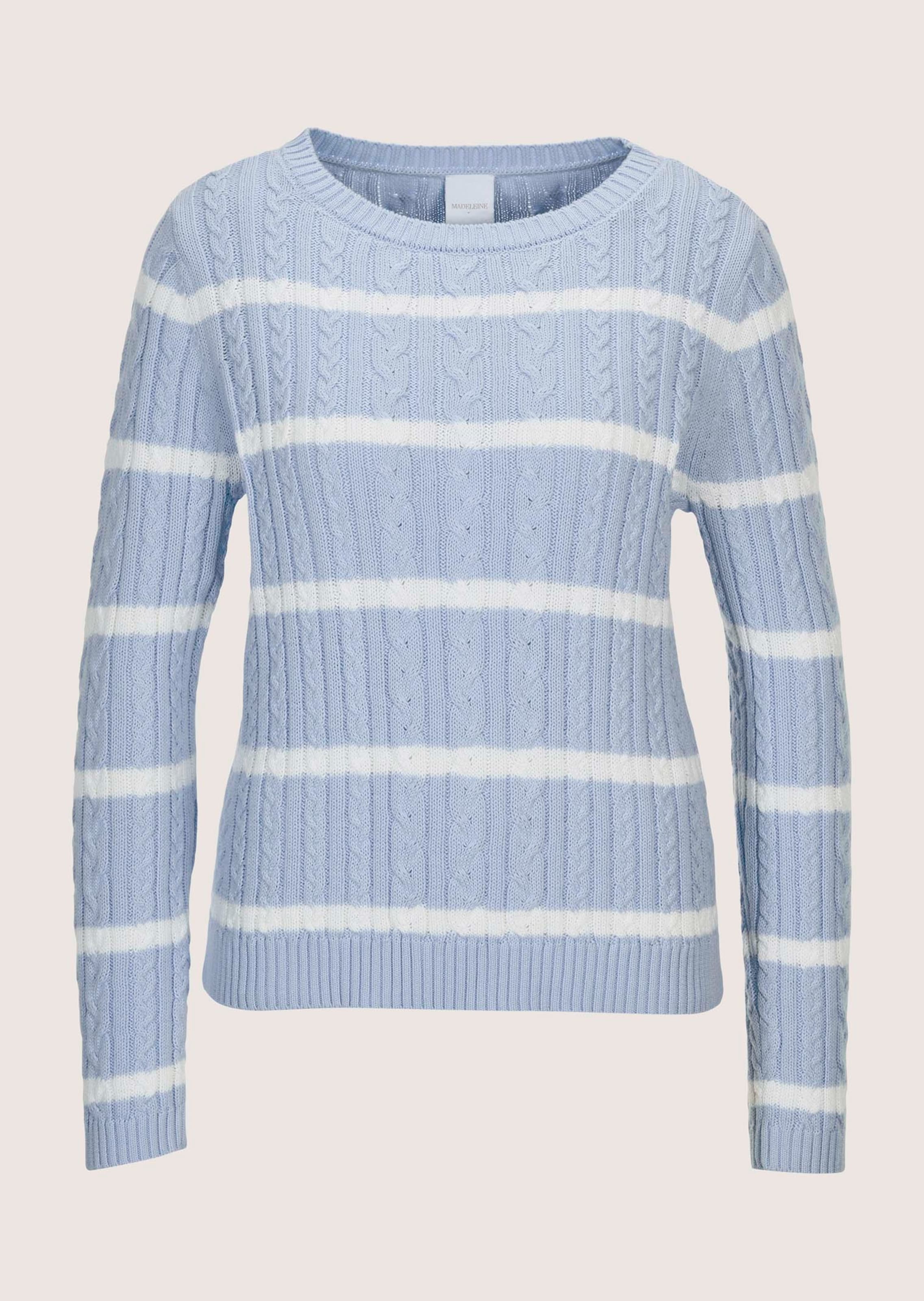Heerlijk comfortabel, huidvriendelijk, natuurlijk garen, all-over in een opvallend kabelpatroon en met contrasterende strepen. Modieus kort model met een ronde hals en lange mouwen. Hals, zoom en mouwen afgewerkt met vormvaste ribtricot zoomboordjes.