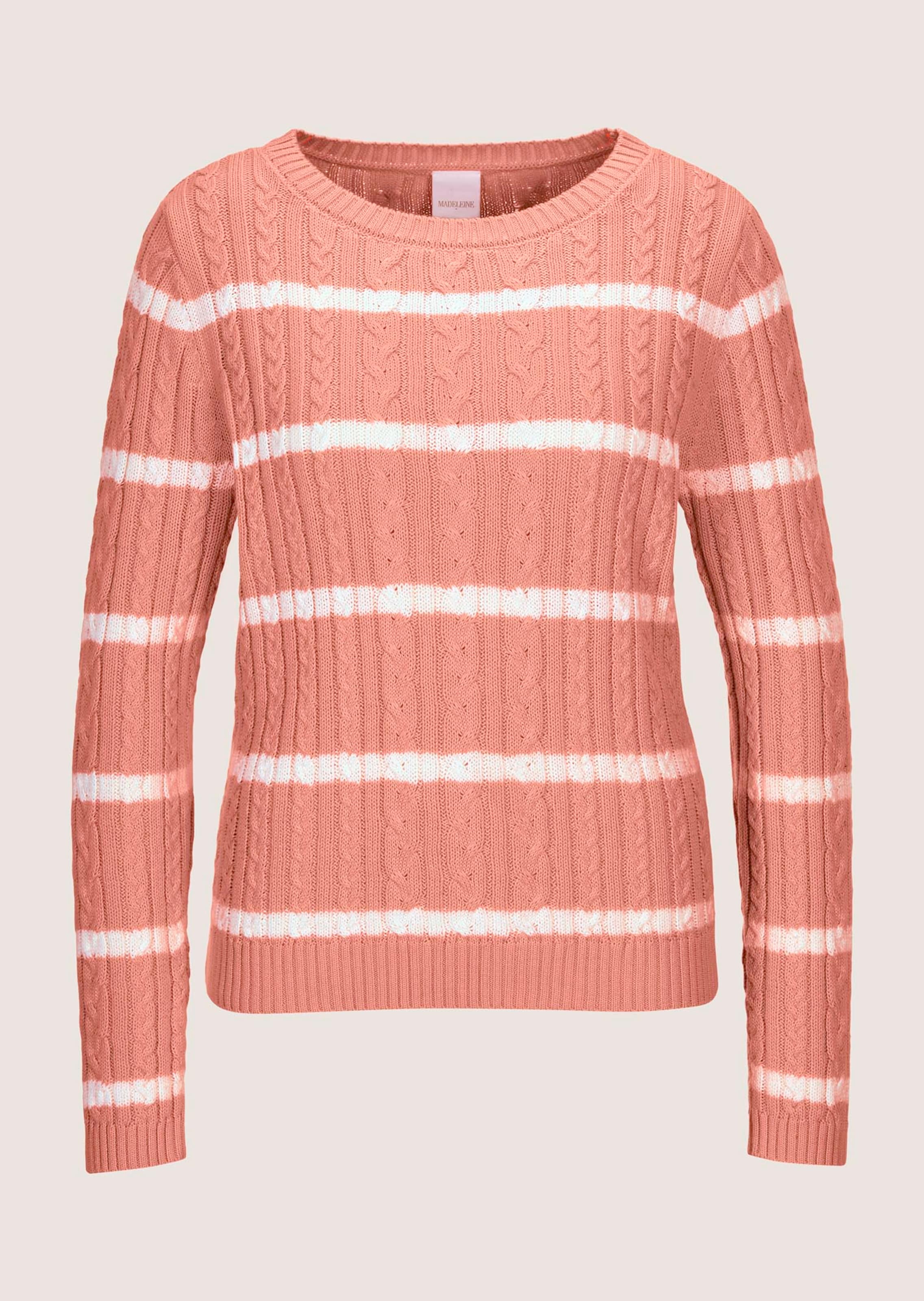 Heerlijk comfortabel, huidvriendelijk, natuurlijk garen, all-over in een opvallend kabelpatroon en met contrasterende strepen. Modieus kort model met een ronde hals en lange mouwen. Hals, zoom en mouwen afgewerkt met vormvaste ribtricot zoomboordjes.
