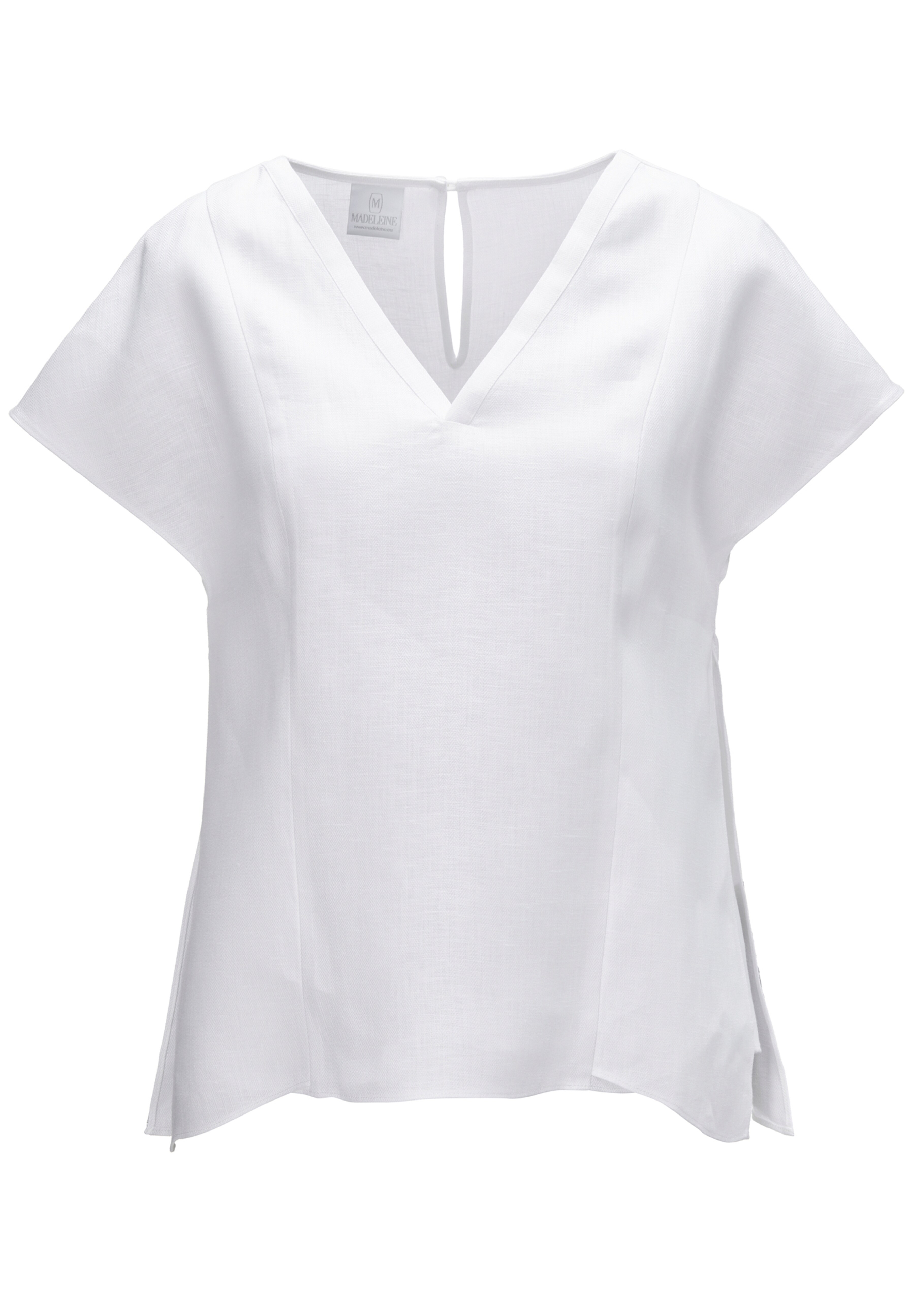 Aangenaam koel op de huid. In nonchalant moderne, iets wijder gesneden stijl; met aangeknipte schouders, V-hals, knoopsluiting aan de achterkant en onderlegde splitten opzij.