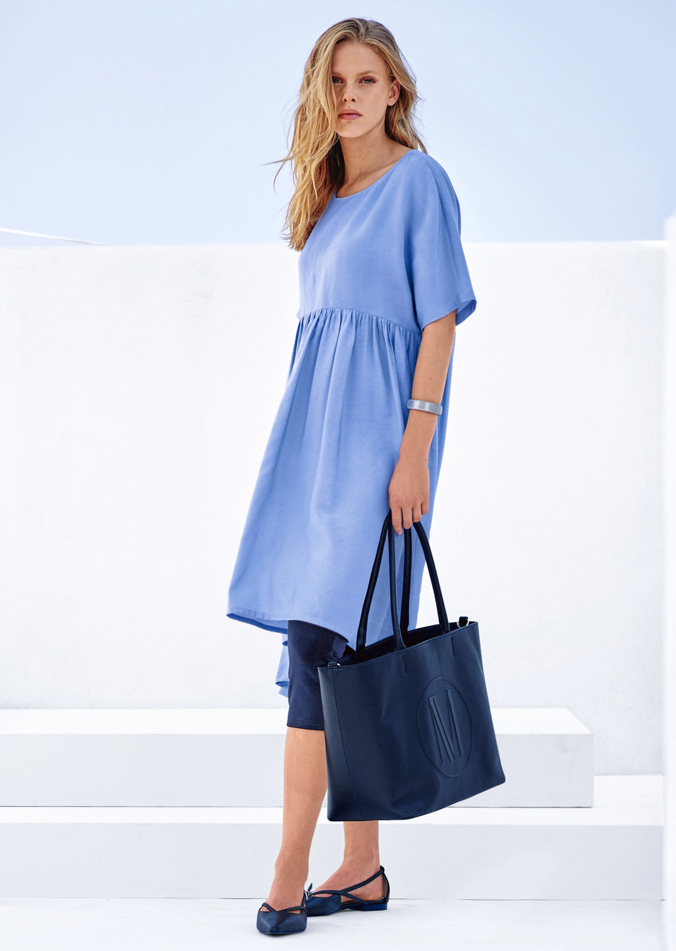Als jurk of tuniek draagbaar. Met ronde hals, aangeknipte schouders, halflange mouwen en verlengde achterkant. Plooitjes langs de taillenaad zorgen voor een mooie, licht uitlopende lijn. Sluiting aan de achterkant met klein splitje en knoop.