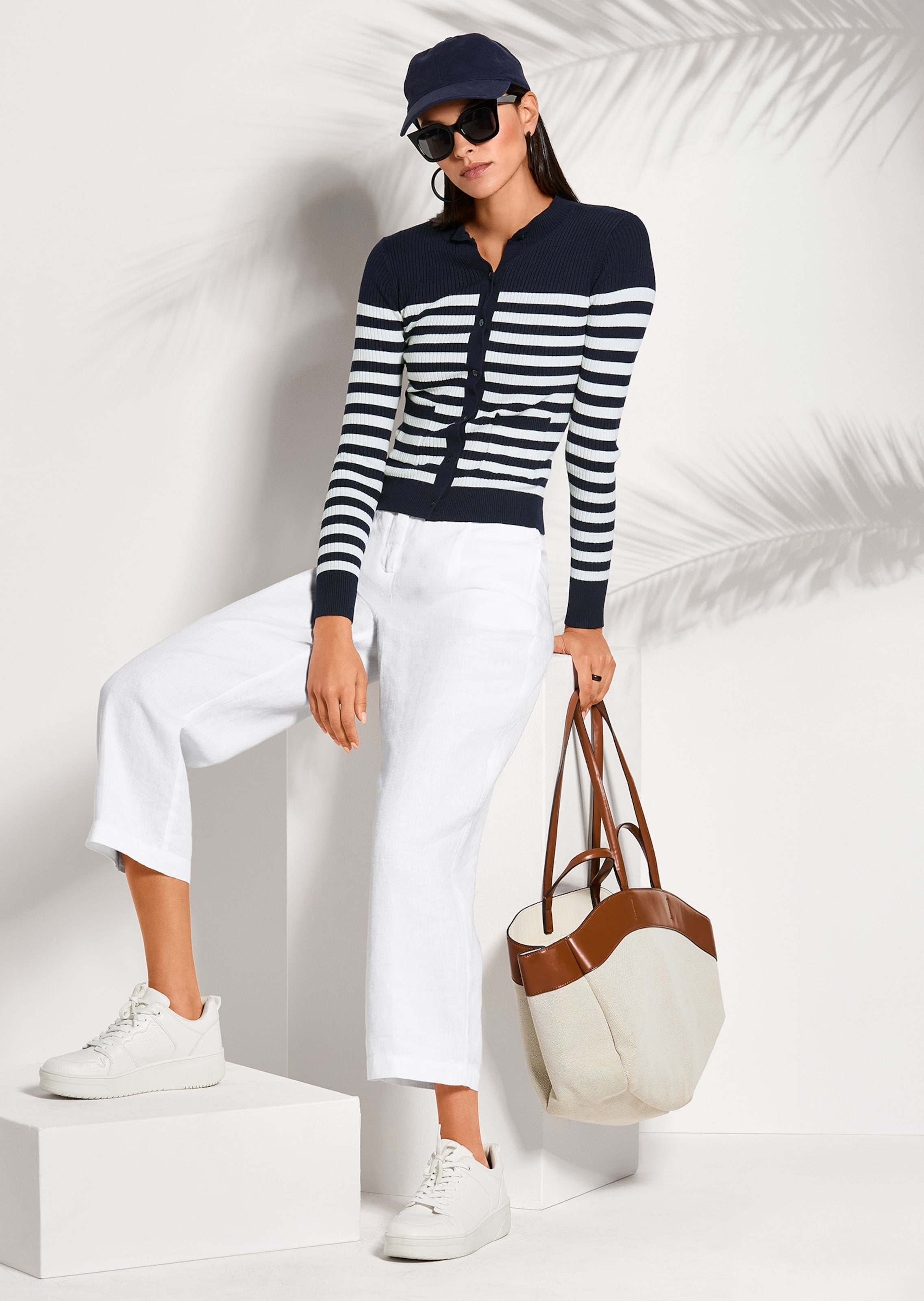 Van huidvriendelijke, mooi in model blijvende ribtricot in een fris dessin van strepen; met een ronde hals, lange mouwen, een doorlopende knopenlijst en opgestikte zakken.