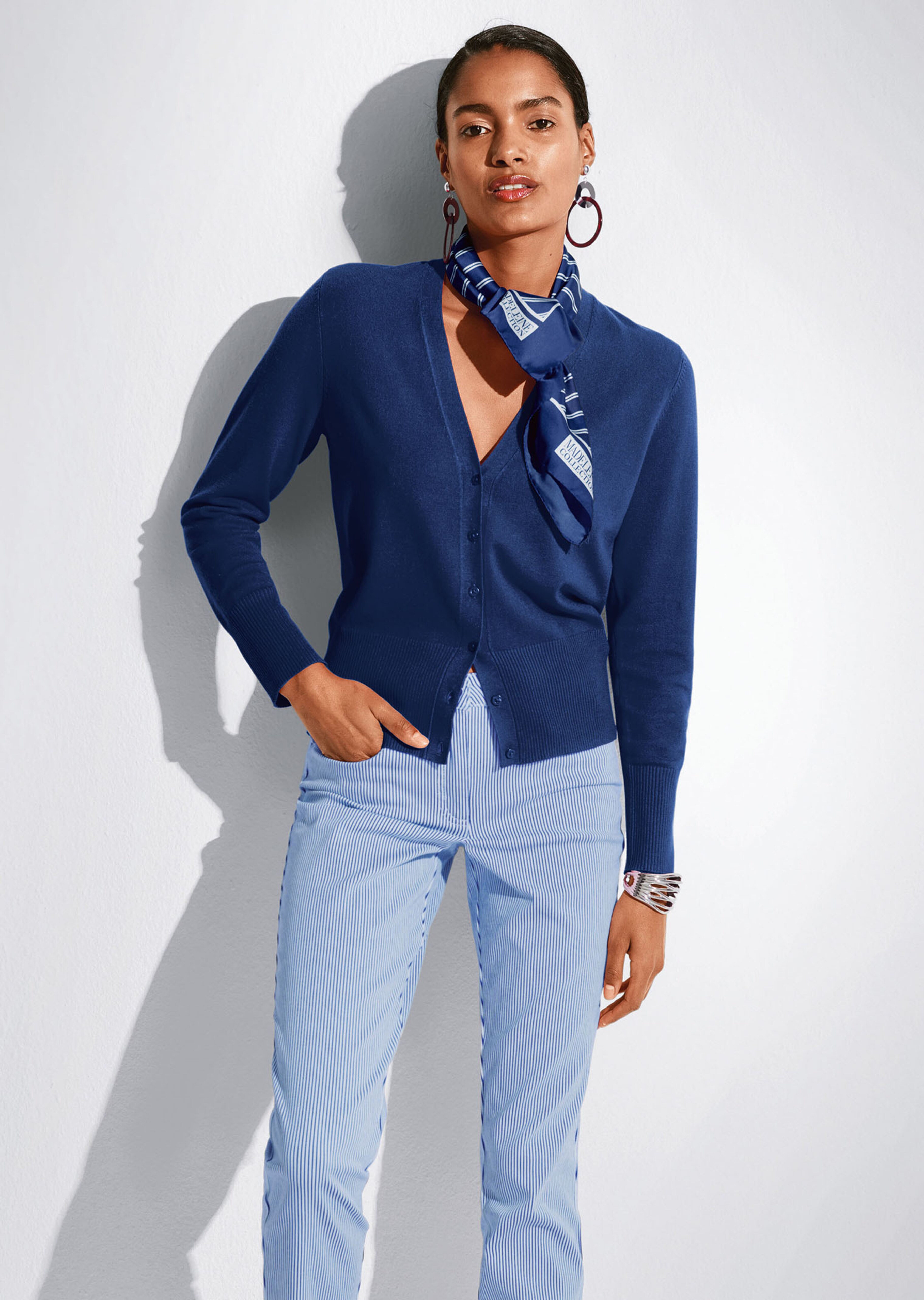 Ribboordjes aan de lange mouwen en zoom. Afgwerkt met een mooie bies langs de V-hals en rand van de sluitlijst.