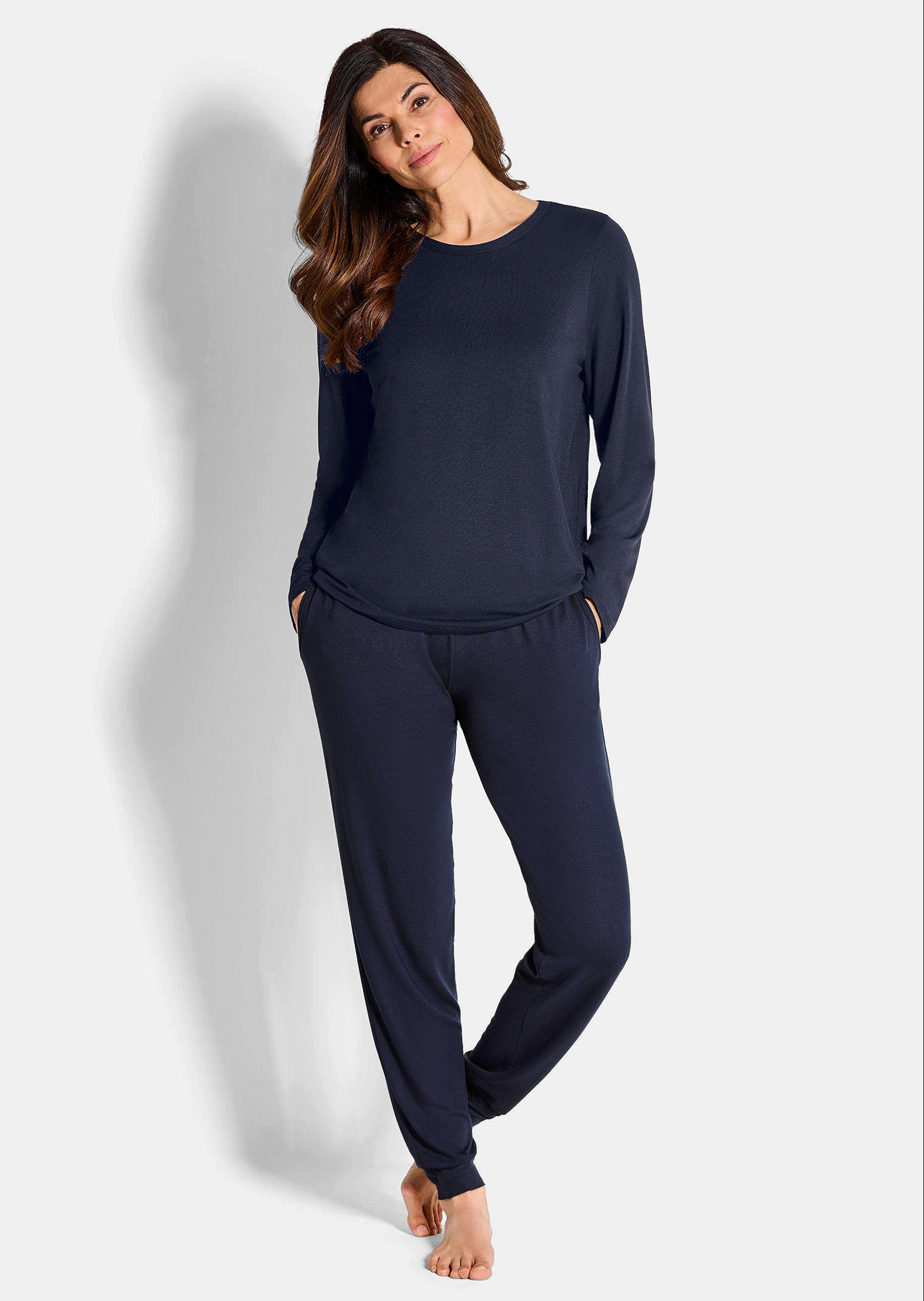Loungewear set from CON-TA – wonderfully soft two-piece set. The micro modal blend with elastane gives the set a fine, smooth feel and subtle sheen. The long-sleeve top with a round neckline falls loosely and comfortably. The trousers have an elasticated waistband, side pockets and leg cuffs to ensure a relaxed fit. Ideal for cosy hours during the day or for restful nights.