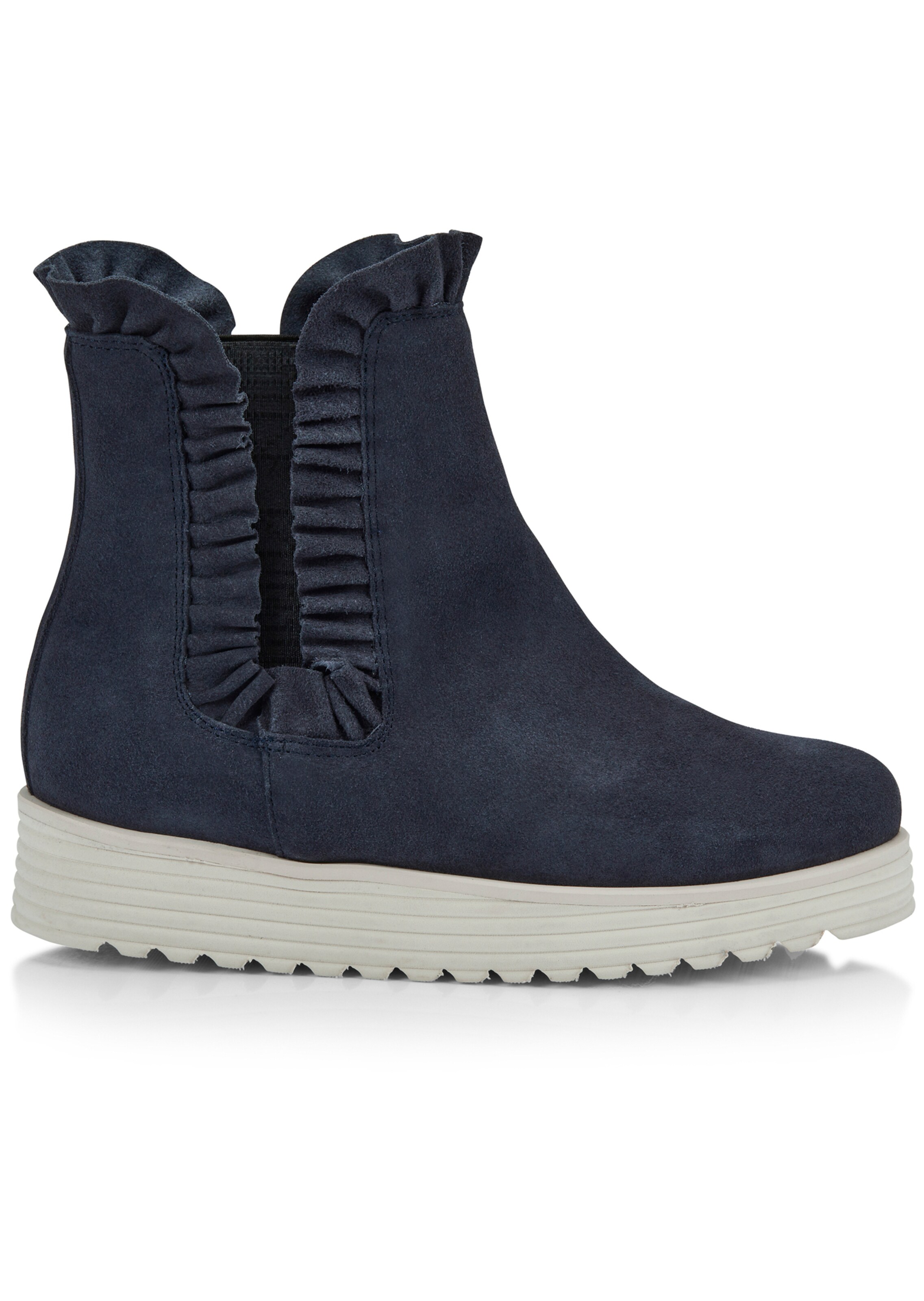 Handmade in Spain. Casual and feminine soft suede boots with ruffled sides and elastic panels.