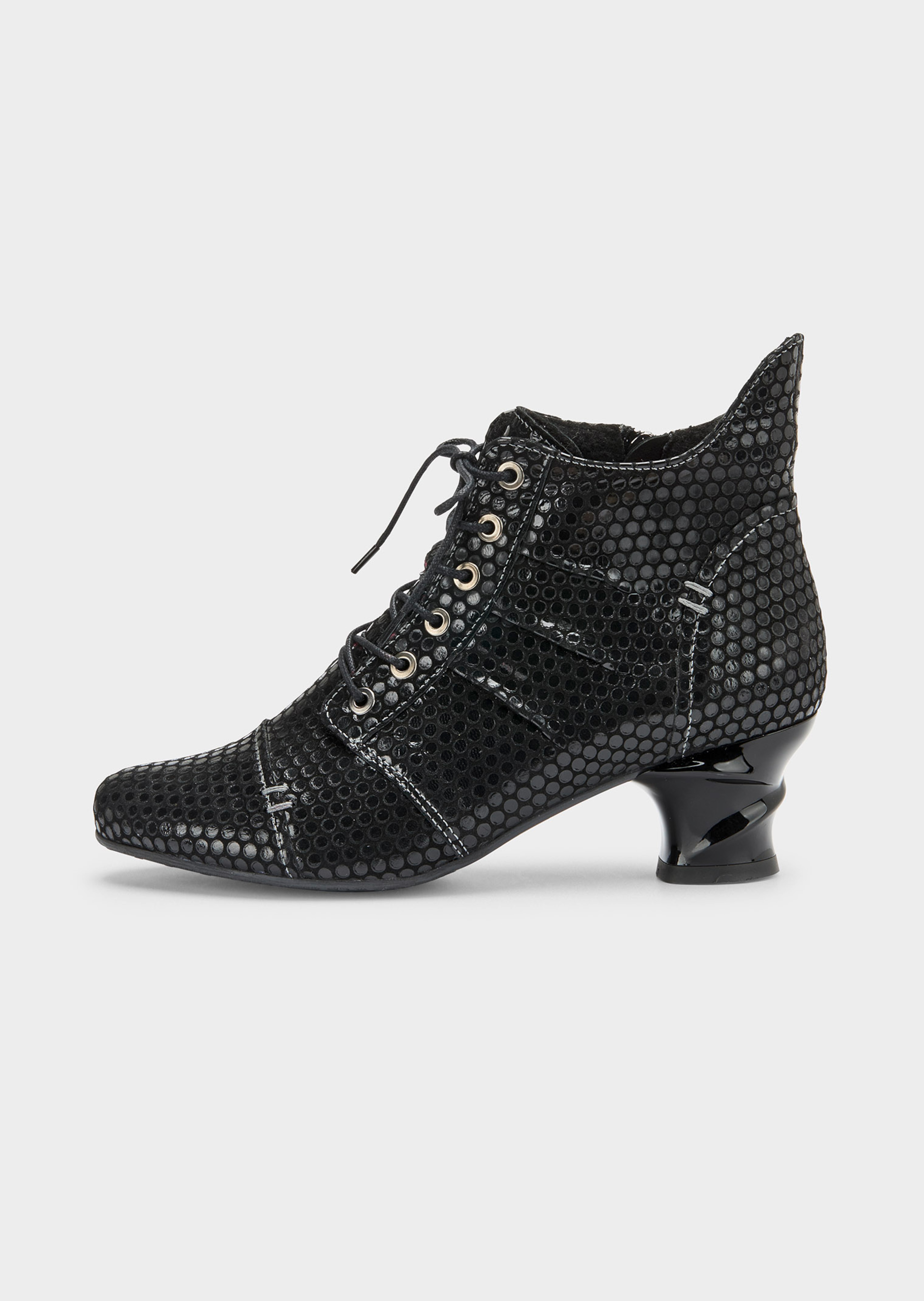 Made of leather with a stylish dot pattern. Lacing and zip. In G width.