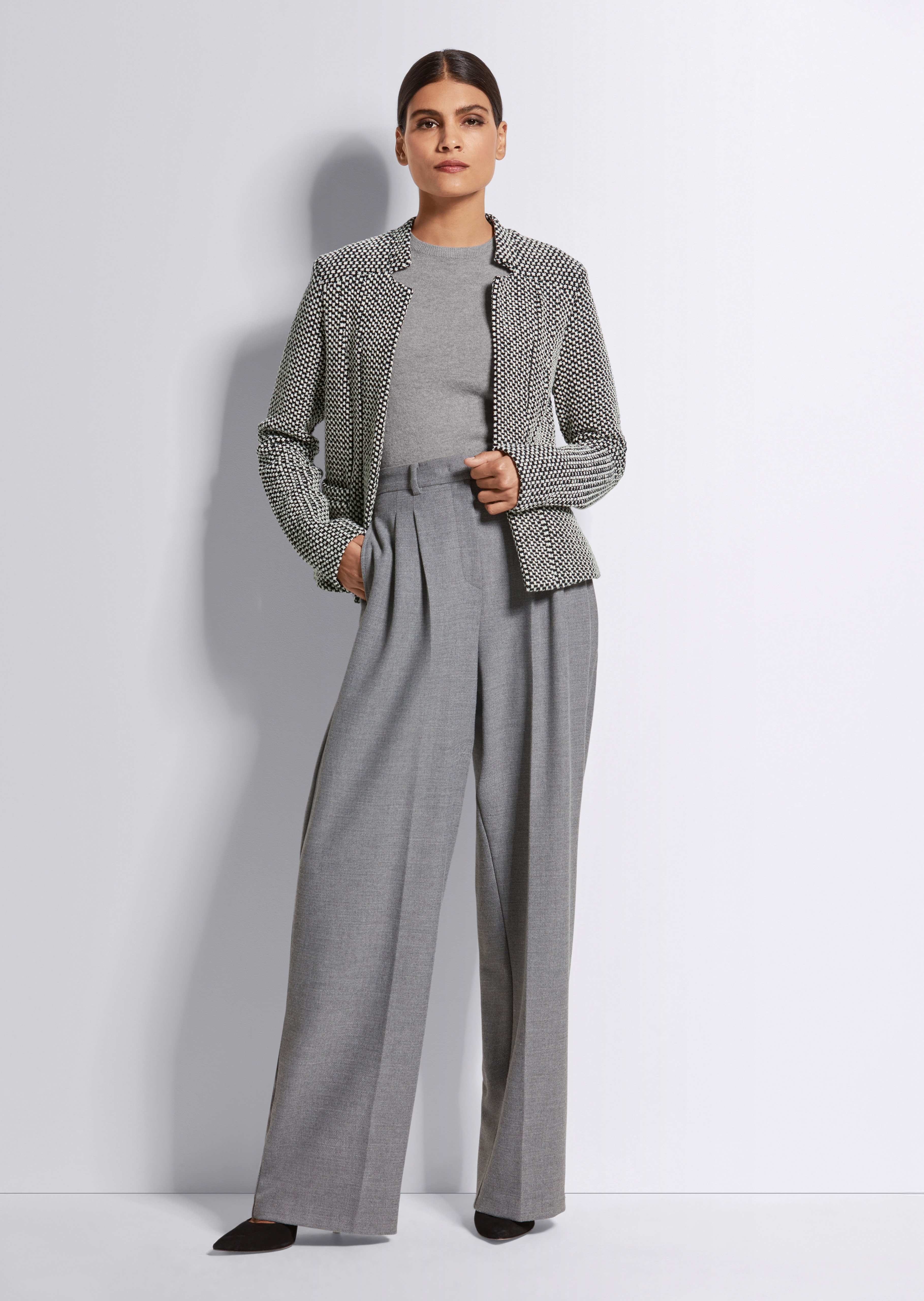 Soft jersey in a fashionable short design with a beautiful texture! Fastening-free version, comfortable to wear and in an elegant tailored line with long sleeves and two welt pockets. Fully lined.
