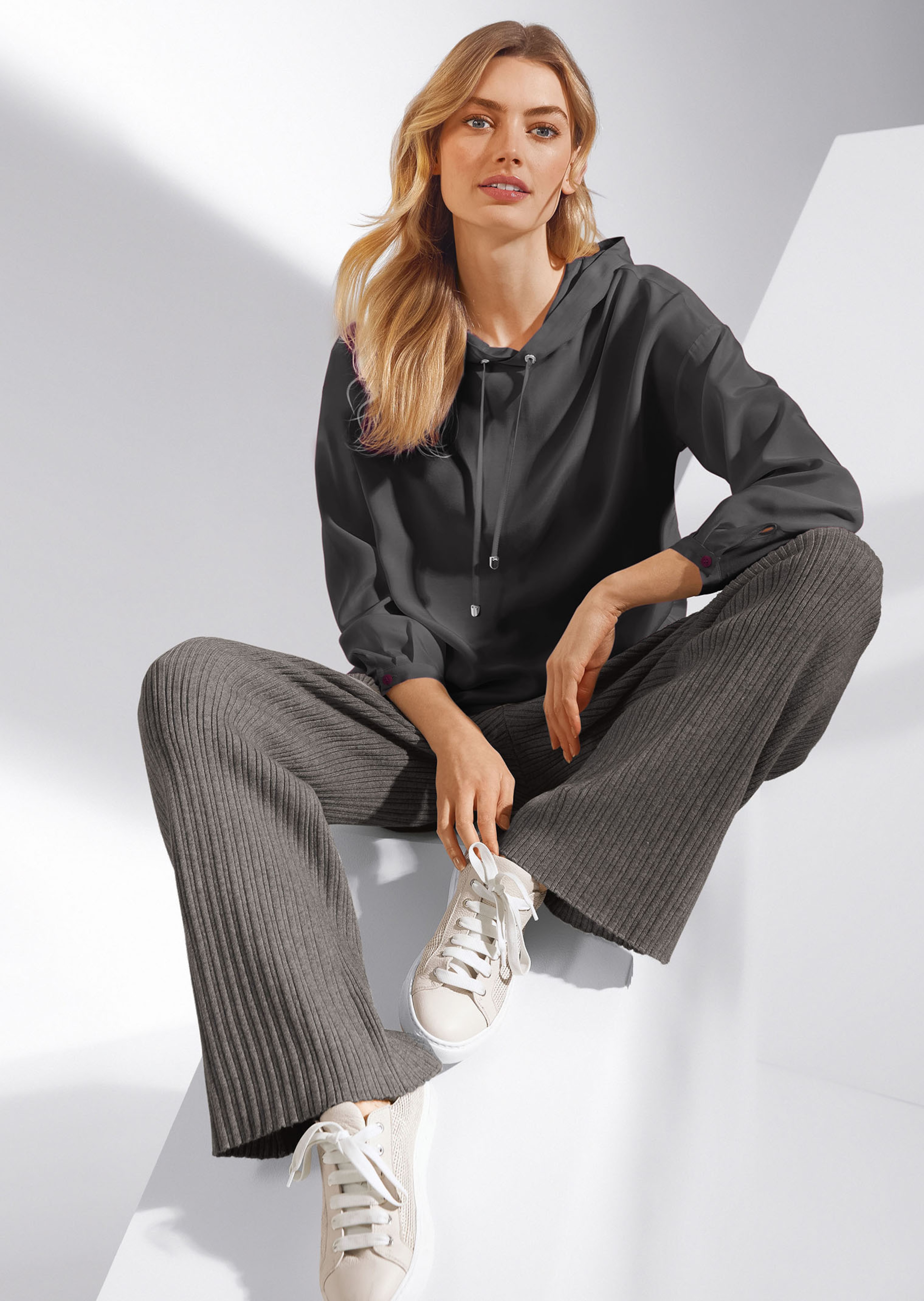 Made of sleek viscose in casual, figure-hugging shape, with long cap sleeves, narrow button cuffs and straight hemline with side slits. Hood with drawstring and long fabric strap, accentuated by metal ends.