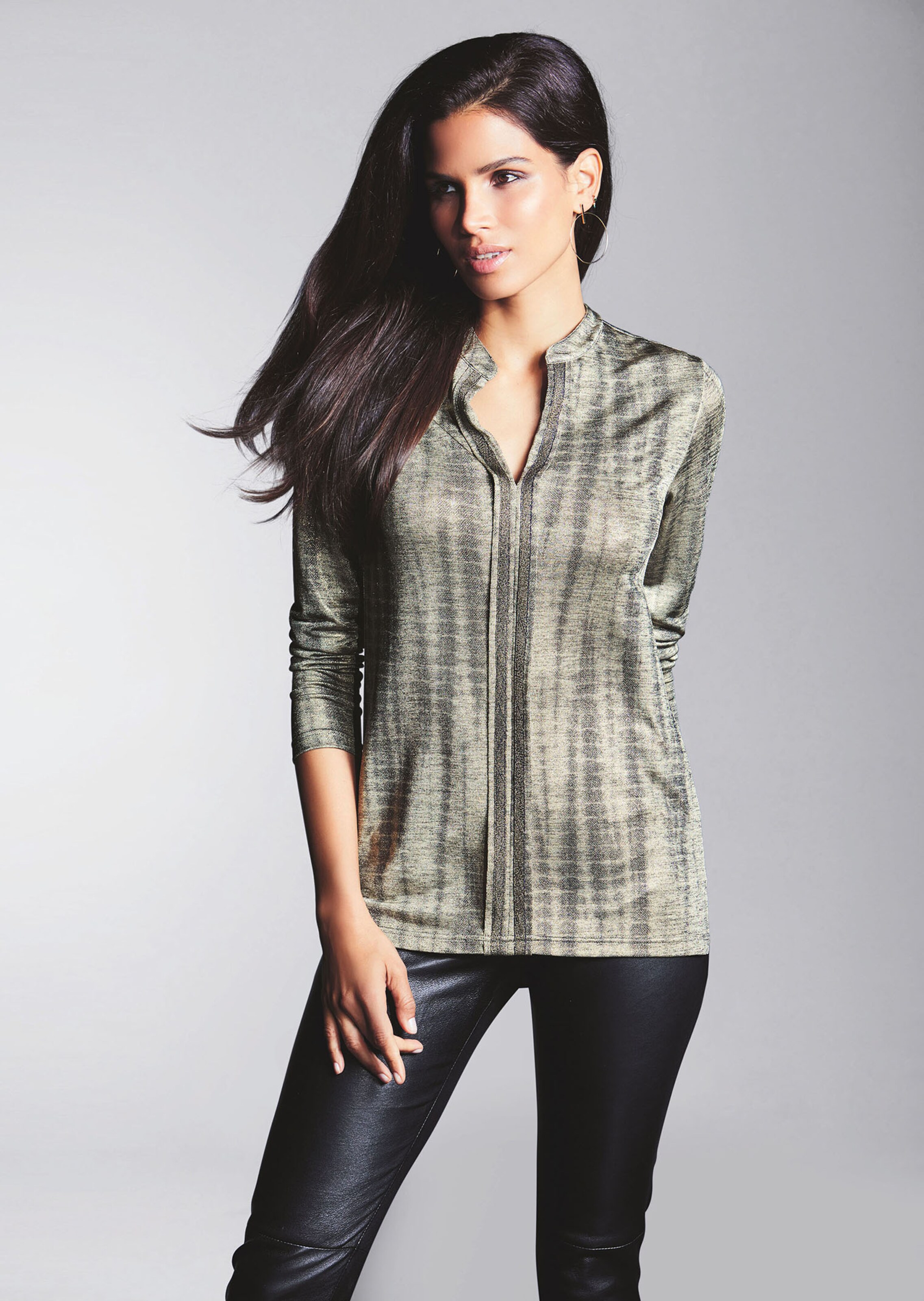 On-trend style, with classy, shimmering fashion print and extended back section. Featuring a V-shaped round neckline and long sleeves.