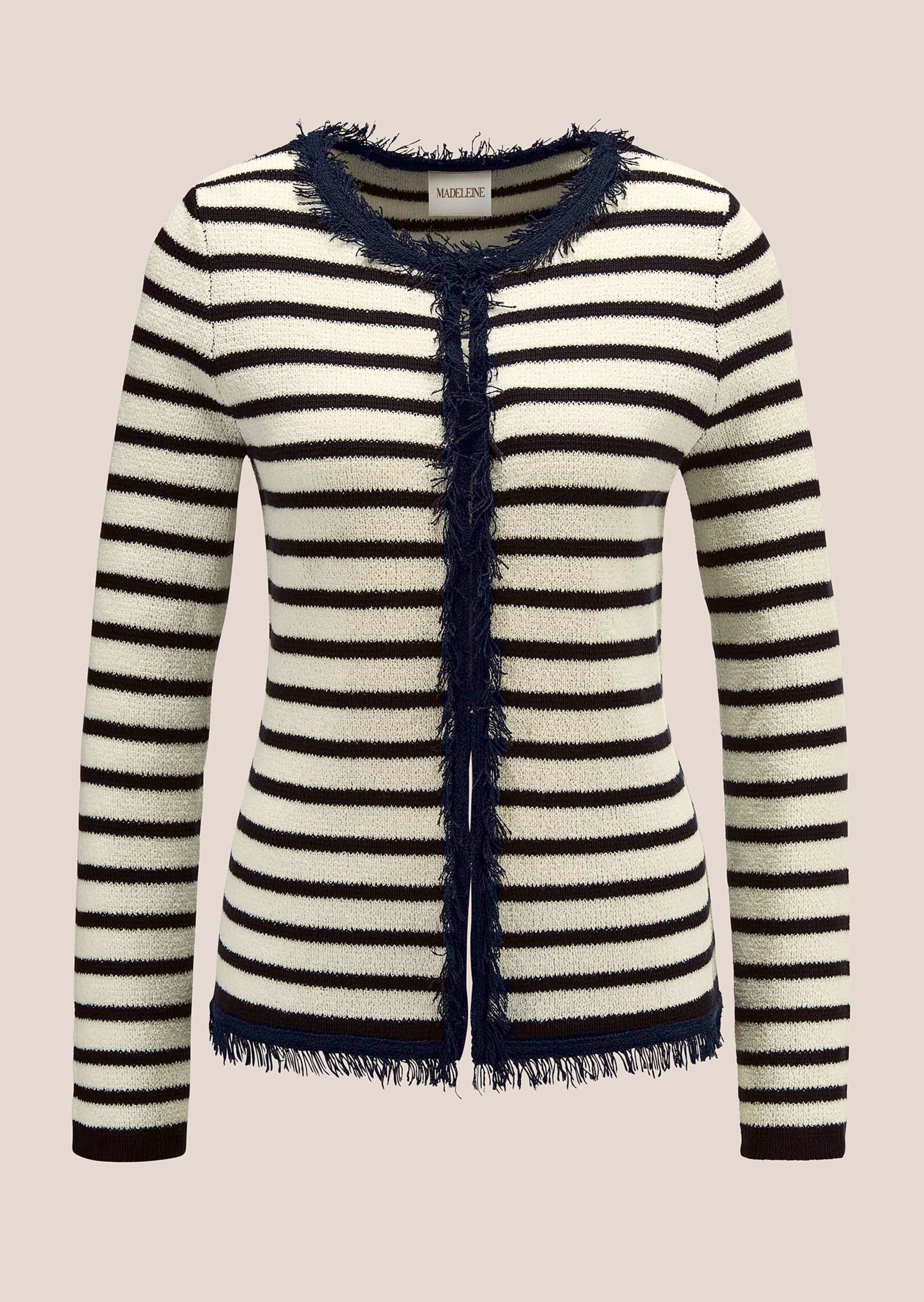 This striped cardigan in bouclé fabric is a timeless wardrobe essential. The subtle fringing at the hem adds a special touch to the jacket. You can open and fasten it effortlessly thanks to the practical hook and eye fastener. With long sleeves.