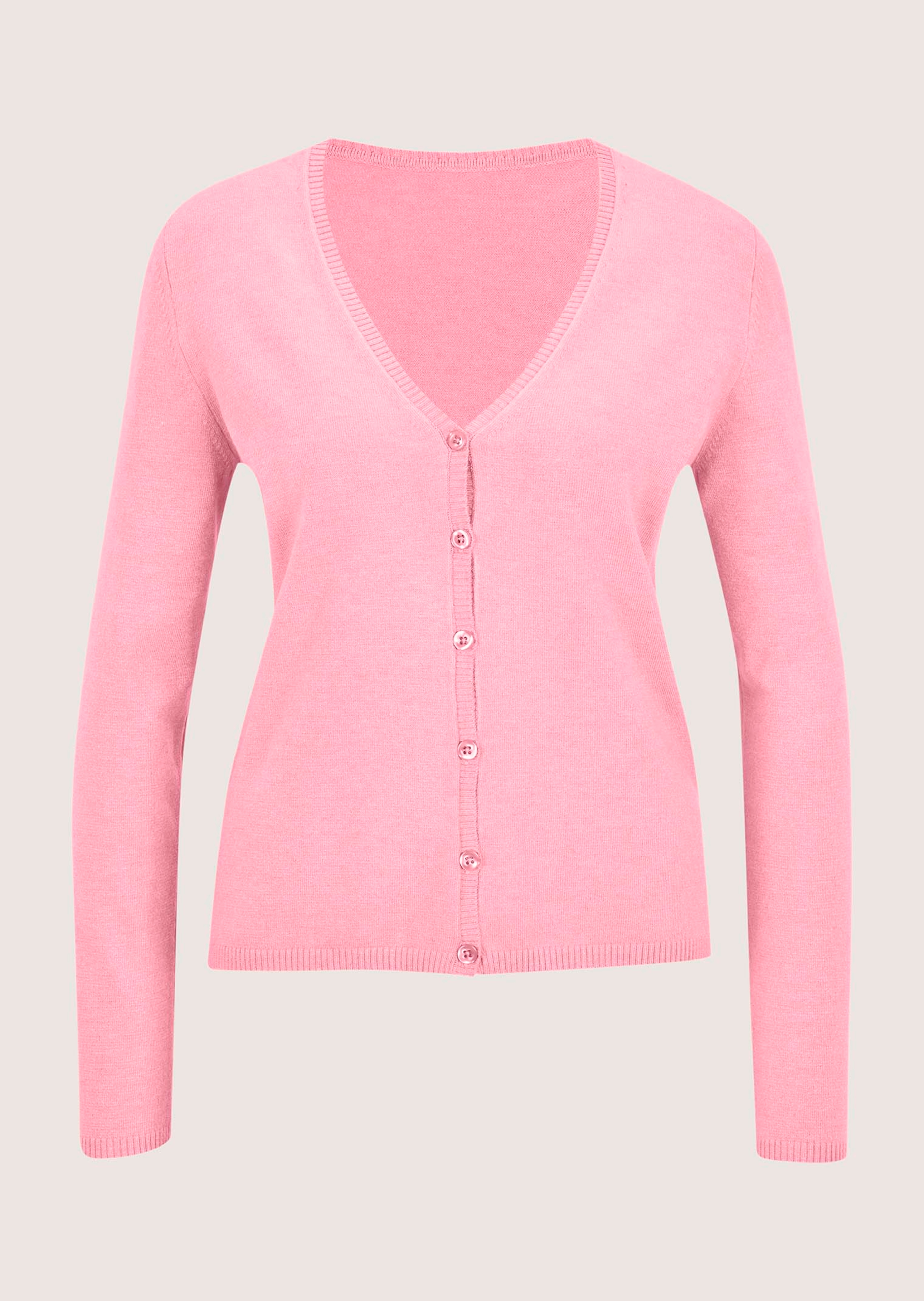 Elegant fine knit in an on-trend short style. Deep V-neckline, long sleeves and subtle button placket with tone-on-tone buttons. Slender ribbed hems on the sleeves, neckline and hem.