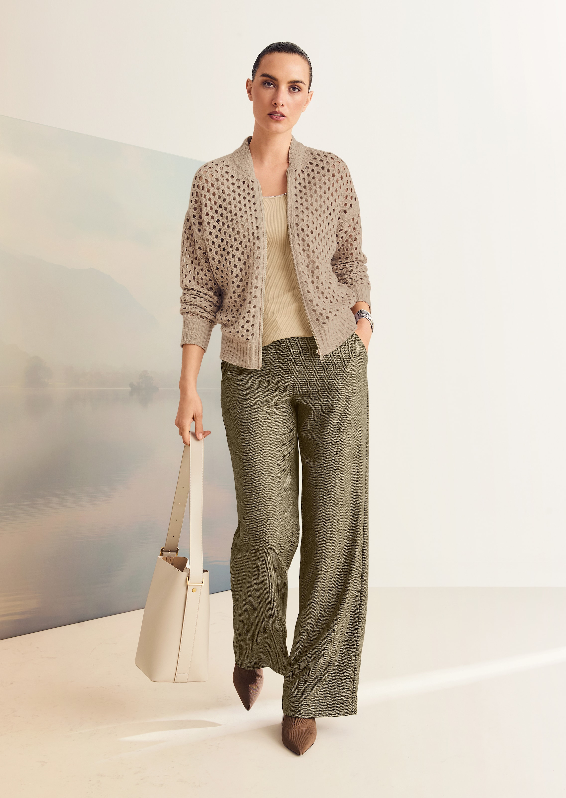 Fluffy, soft knit with a chunky ajour pattern all over that reveals a hint of skin. Stylish knitted design with an attractive stand-up collar, comfortably dropped shoulders, long sleeves and a sporty front zip. Collar, cuffs and hem in shape-retaining ribbed knit.