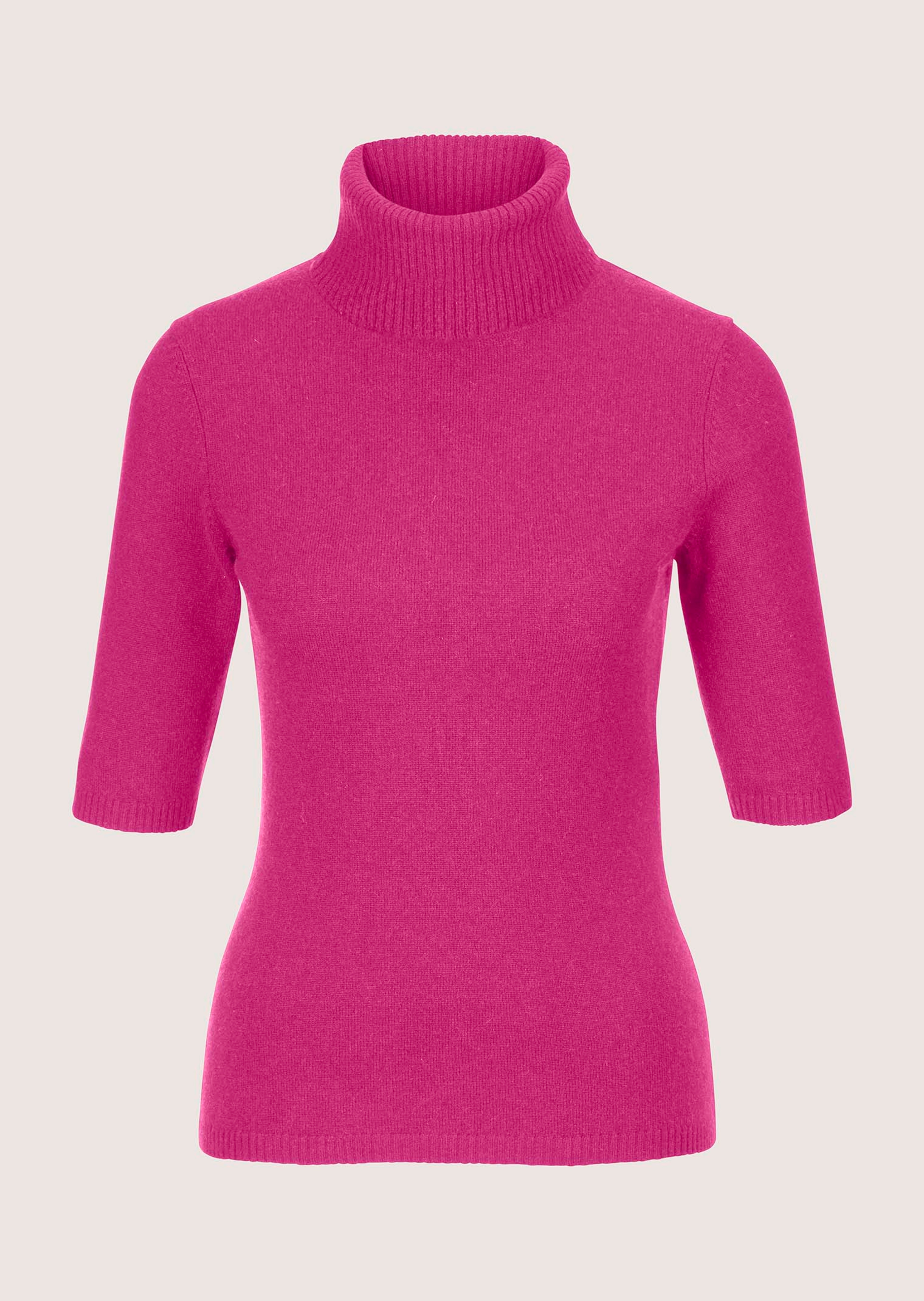 Elegant knit made of soft luxury yarn. Moderately tailored with roll neck, half-length sleeves and ribbed trims.
