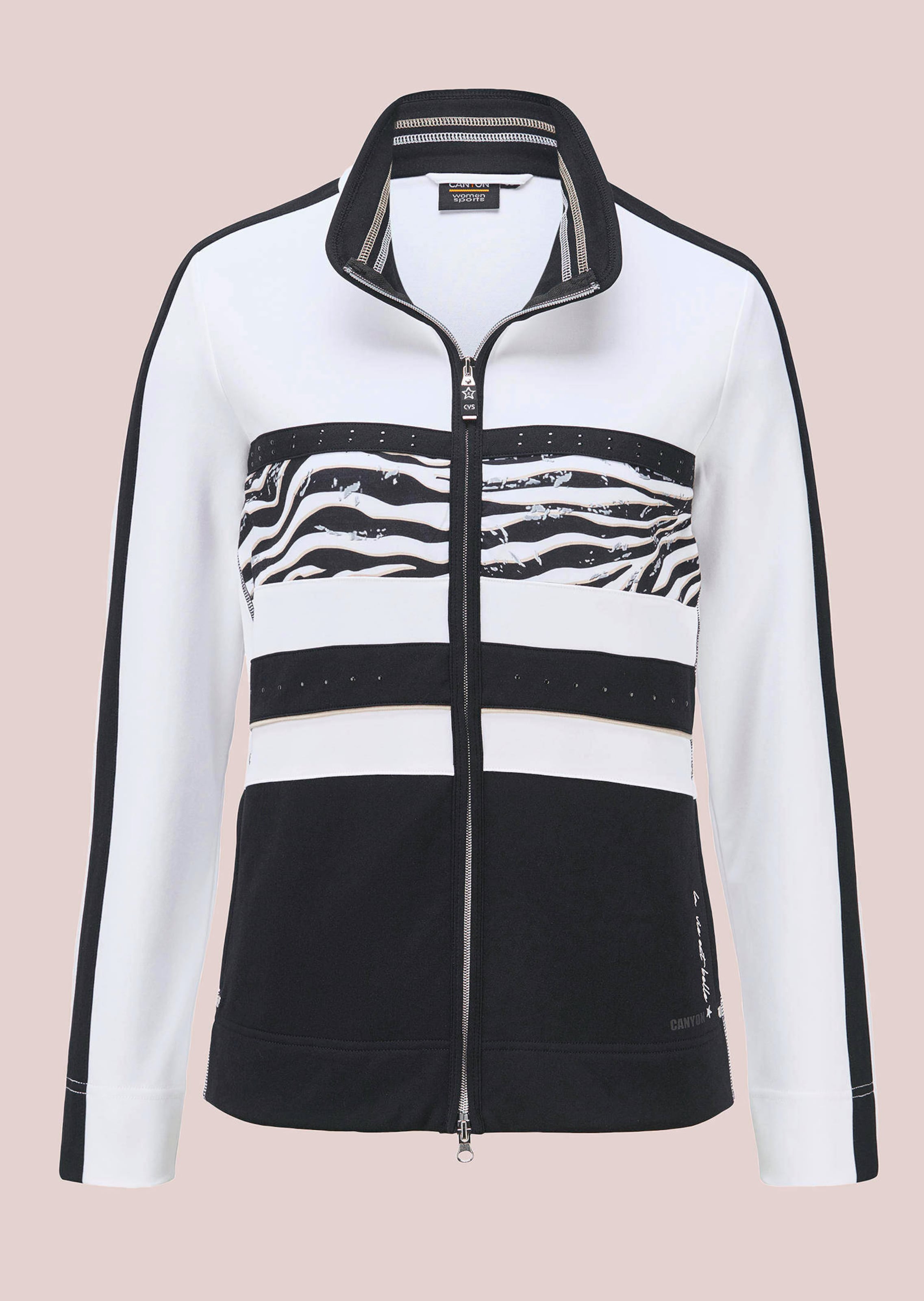 This leisure jacket by CANYON ensures maximum comfort with its smooth, dense cotton jersey fabric. The material is shape-retaining thanks to elastane and feels soft against the skin. The high stand-up collar with contrasting striped trim can also be worn turned down. The front section in a fashionable striped look and the full-length zip with decorative zip pull emphasise the sporty, elegant look. Two practical side pockets, a wide, straight bottom hem and sleeves with contrasting-coloured stripes round off the design.