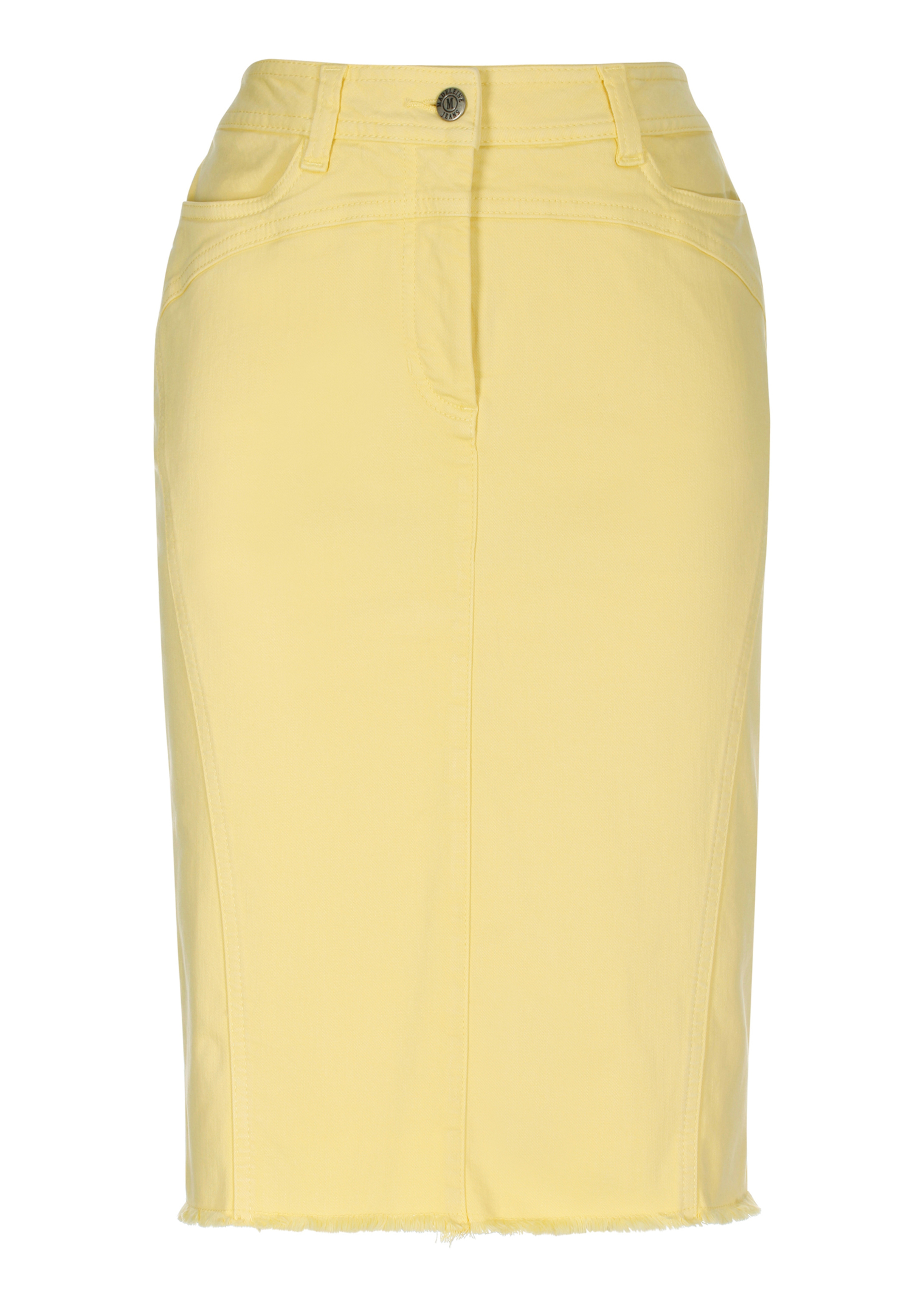 Stretch comfort in a slim pencil shape. With fringed hem, scoop pockets and back yoke.
