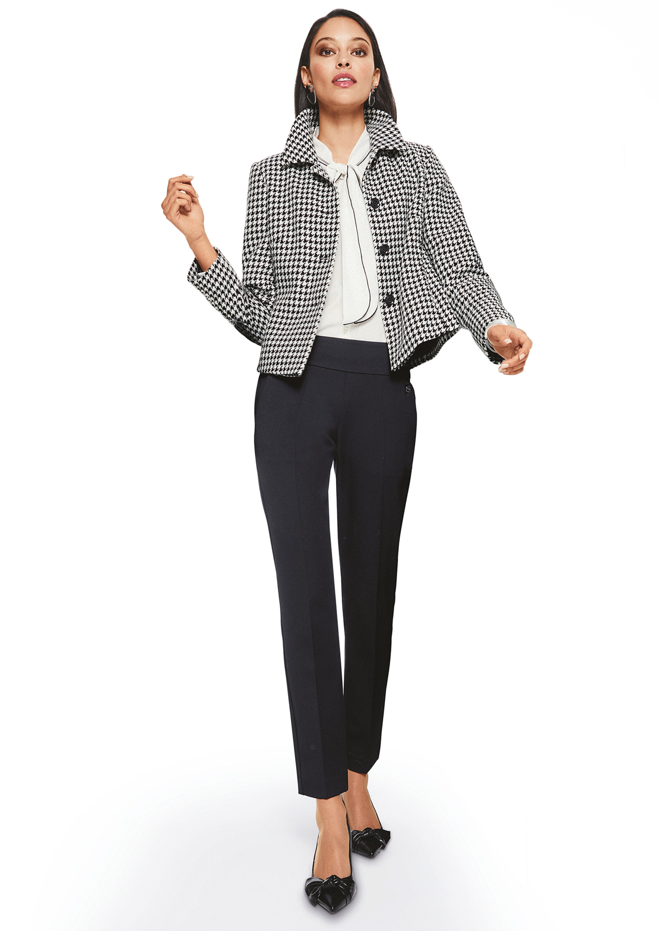 Short, on-trend blazer in stylish dogtooth pattern and femininely tailored shape, with shirt collar, seam pockets and button fastening. In a comfortable blend including warm wool.