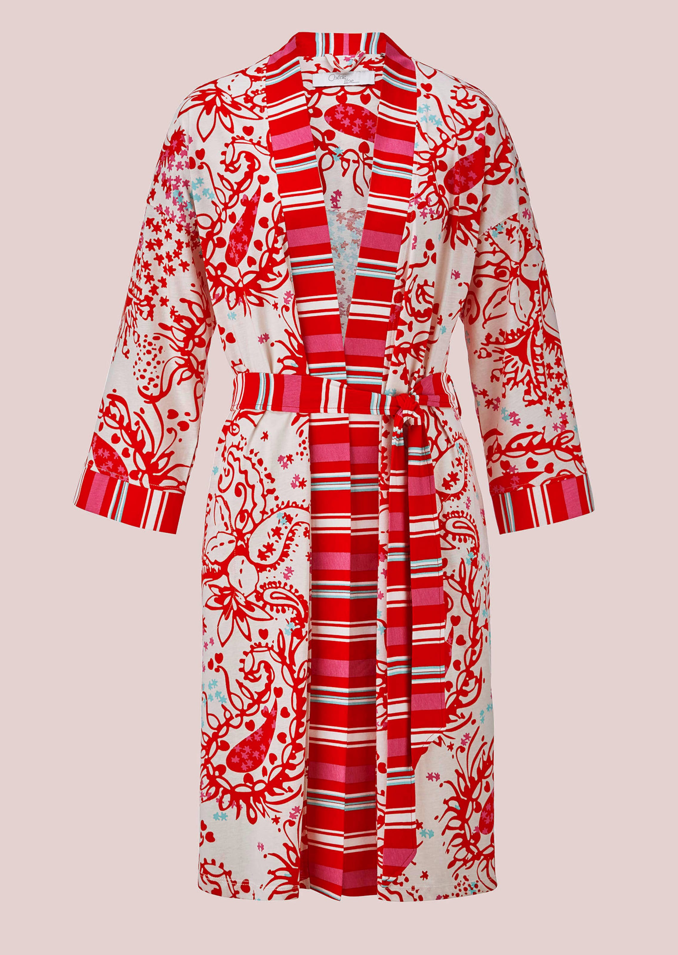 The dressing gown by CHÉRIE LINE is an elegant companion for cosy hours at home. A harmonious colour print meets soft jersey fabric made from a cotton and modal blend. This model has a classic wrap-around look and can be styled individually. Wide striped trims on the sleeves and waistband as well as the long fabric belt provide an elegant highlight, while practical pockets offer additional comfort.