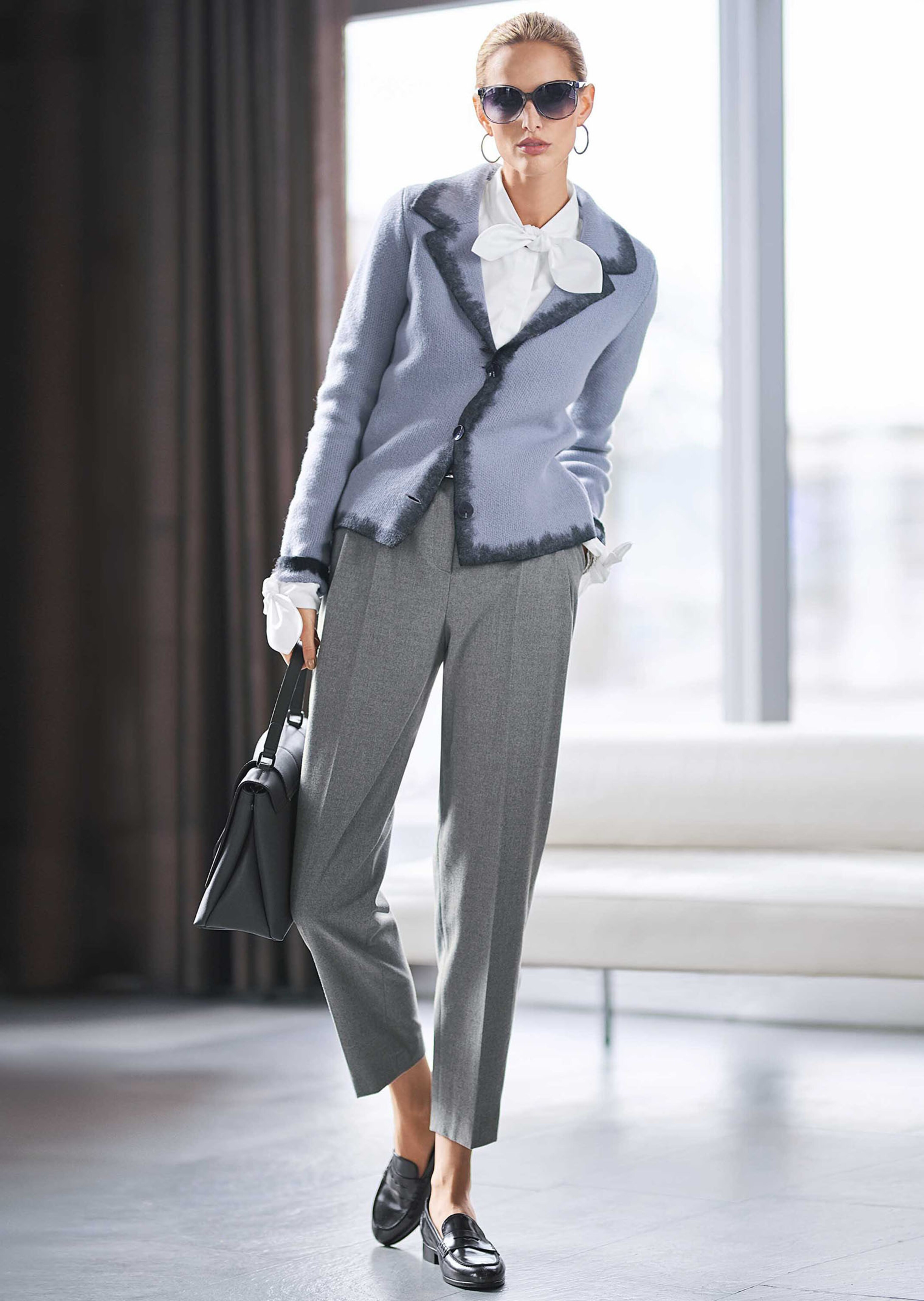Easy-care trousers with slanted pockets, waistband pleats, centre crease, and faux back pockets. Waistband with belt loops.