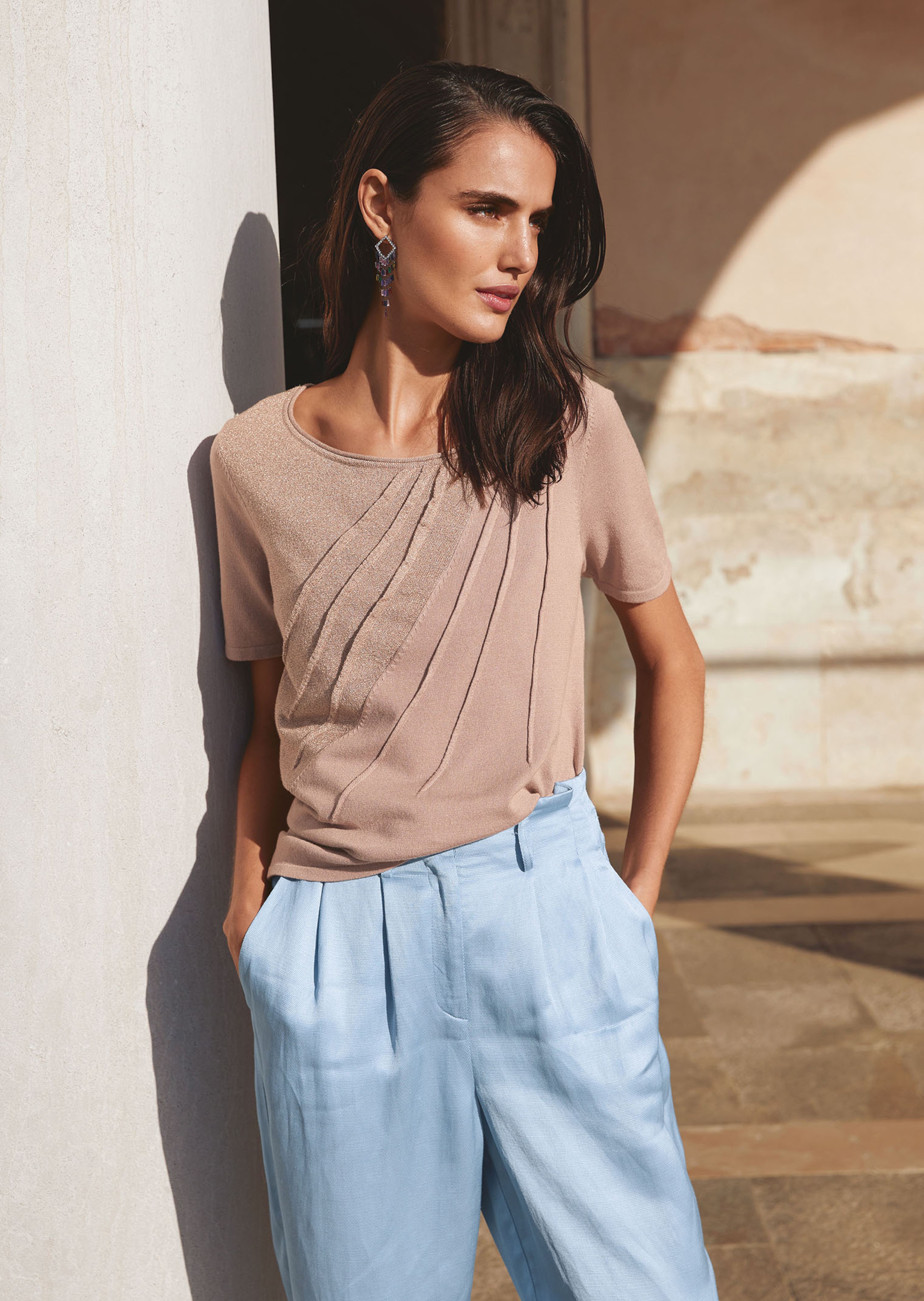 With festive appeal and partial glazed yarn effects and diagonal pleating on both front and back. Form-fitting shape with round neckline and short sleeves.