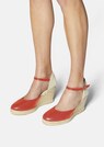 Handmade in Spain from a mix of leather and fabric with high wedge heel and ankle strap.
