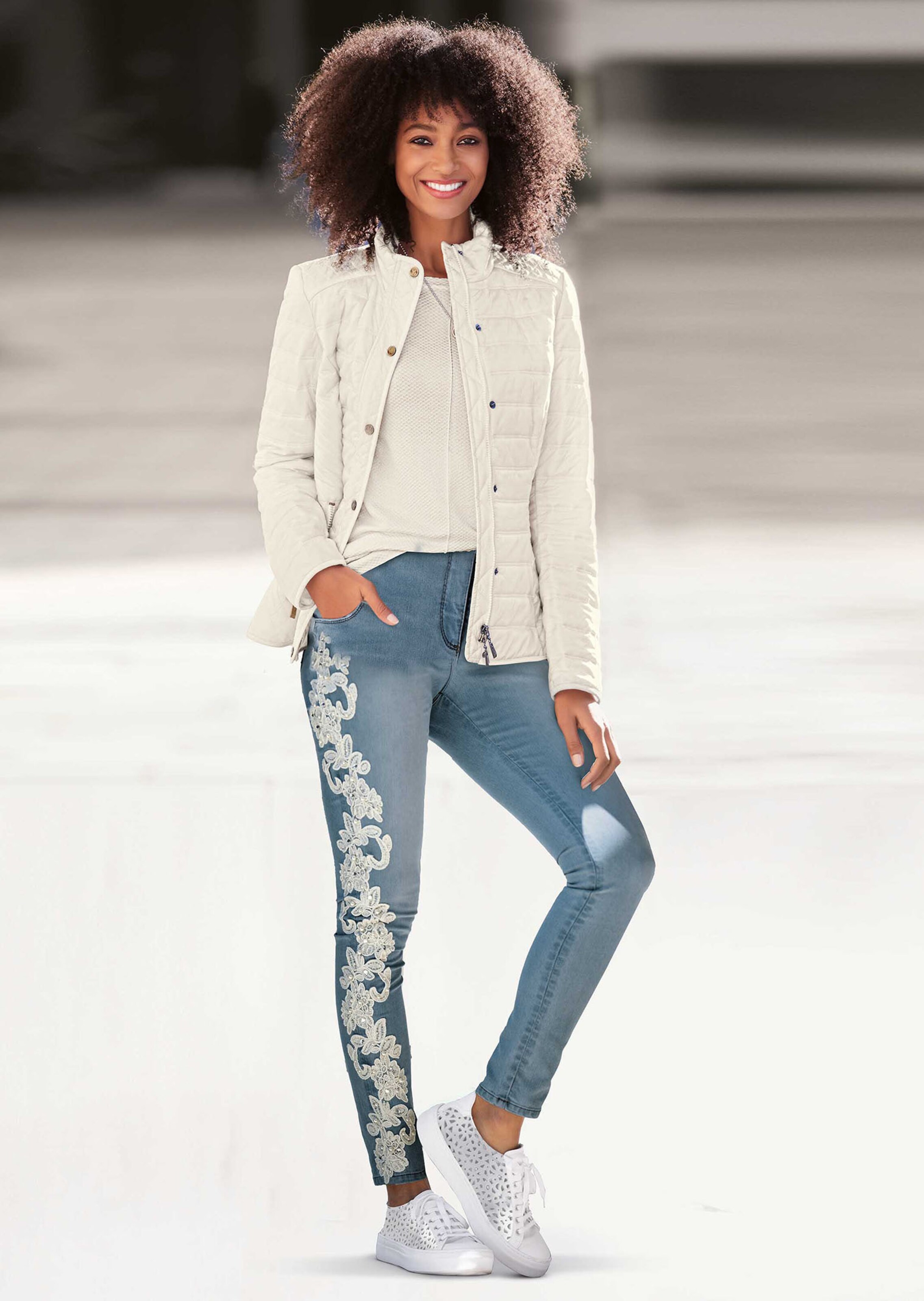 With exquisite lace appliqué, faux pearls and tiny rhinestones along the side. Slim-fit, ankle length 5-pocket jeans. Comfortable stretch denim with light wash effect.