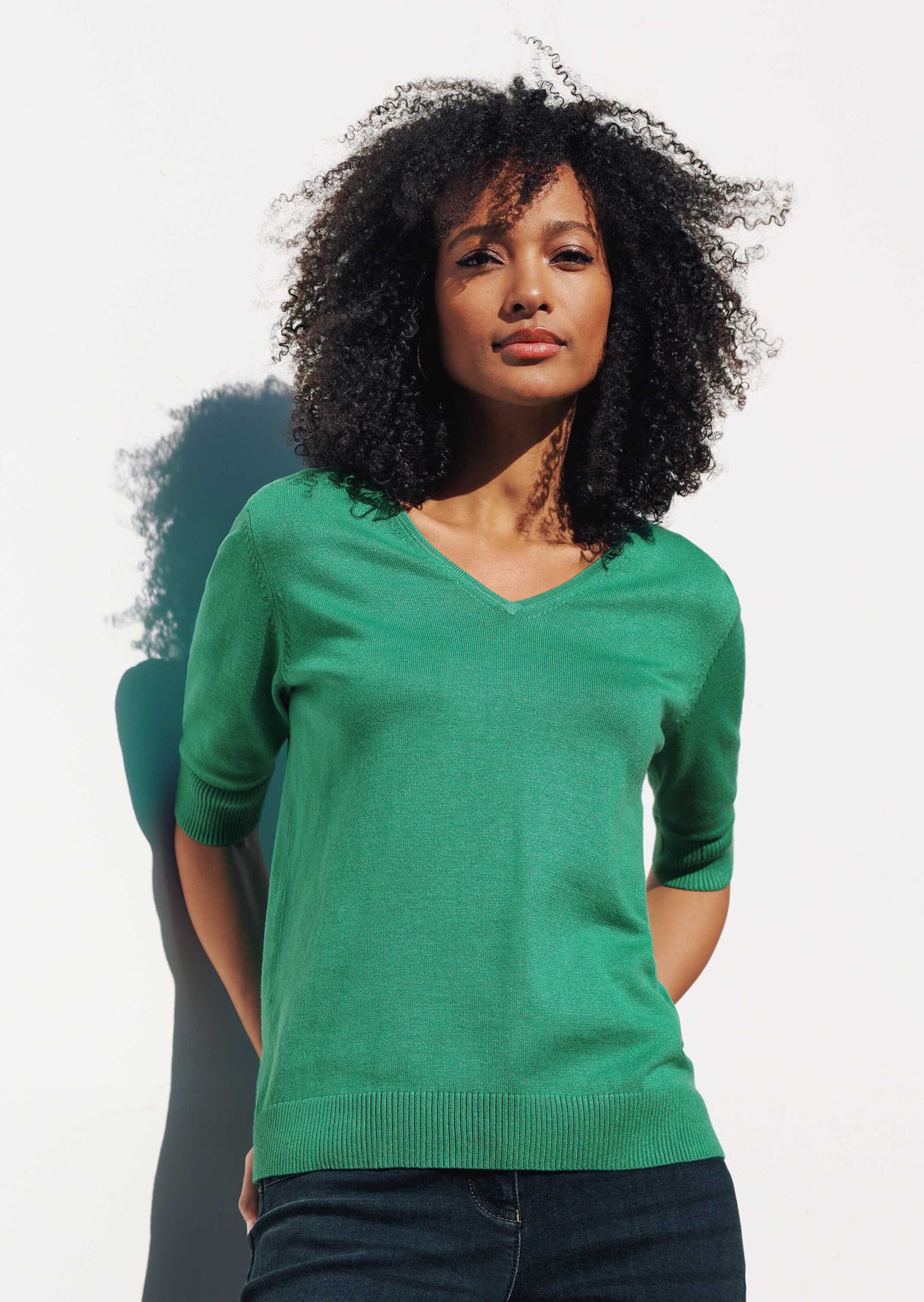 Made of soft stretch viscose. Top-quality knitted jumper with V-neck and half-length sleeves.